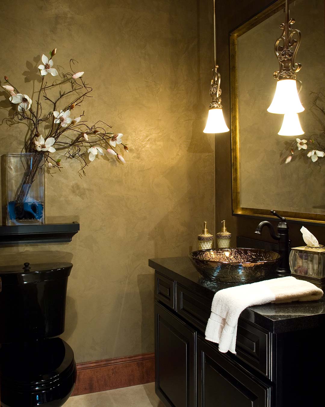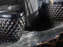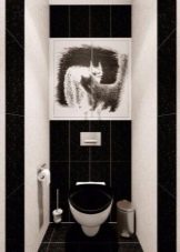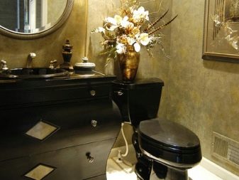 - Wenn schwarze Sanitärelemente in der Toilette oder im Bad sind, ist es wichtig, dass diese Zusammensetzung mit hellen Akzenten verdünnt wird. Dies können verschiedene Zubehörteile wie Vasen und Figuren sein. Wenn der Raum dimensional ist, können Sie die Wände mit einer Reihe von Fotos oder Gemälden dekorieren.