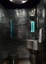 - Manchmal ist Schwarz durch das Vorhandensein eines metallischen Glanzes dunkelgrau eingefasst. Metallic-Effekt macht die Oberfläche der Toilettenschüssel noch interessanter. Diese Option wird perfekt mit modernen Einrichtungsstilen kombiniert.