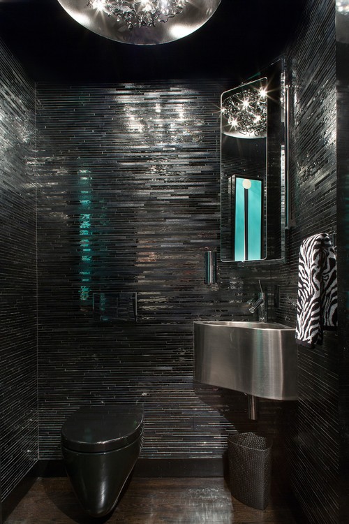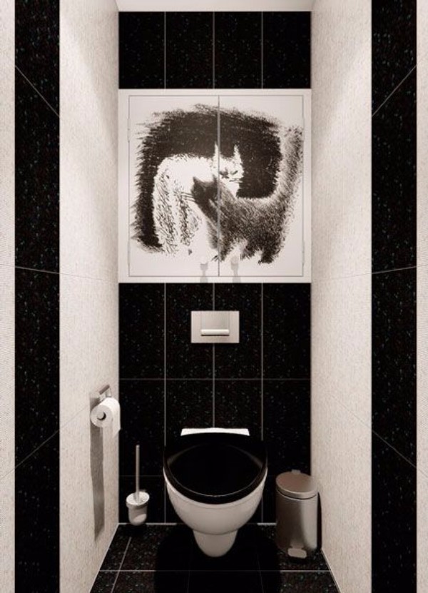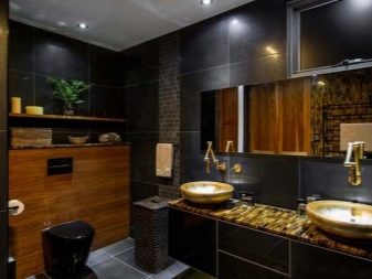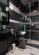 - Der ähnliche Farbton einer Toilettenschüssel ist ein wichtiges Merkmal eines Interieurs. Es ist der schwarze Klempner wird der Hauptakzent und hebt die Eigenschaften des gewählten Stils hervor.