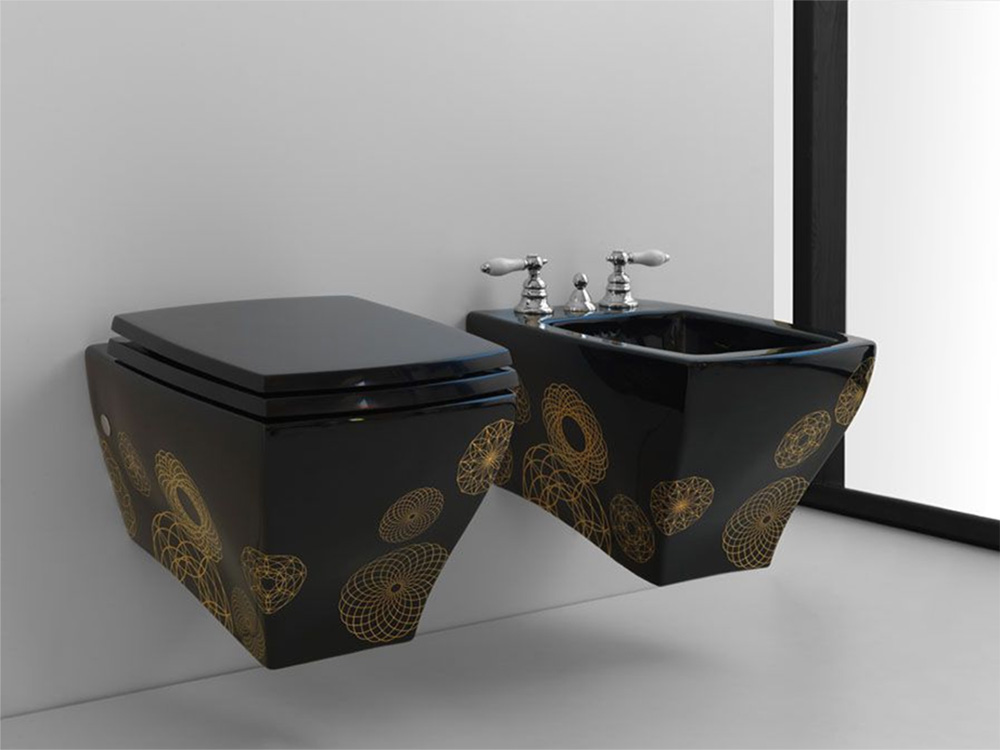 - Der Körper der Rohrleitungen muss nicht eintönig sein. Moderne Technologie und eine große Auswahl an schwarzen Produkten in Geschäften ermöglichen es Ihnen, eine Toilette zu kaufen, die mit Ornamenten in Form von Gemüse oder anderen Mustern dekoriert ist.