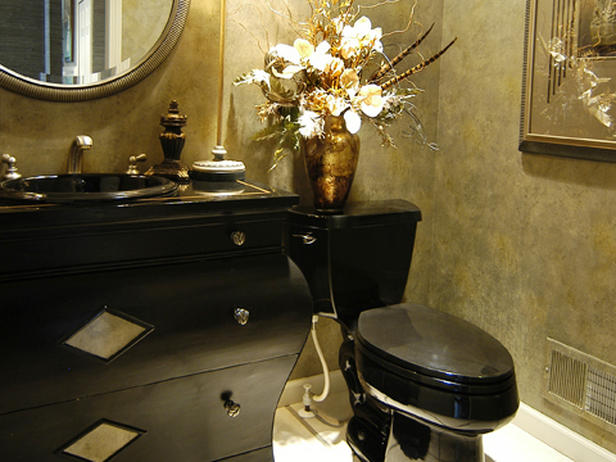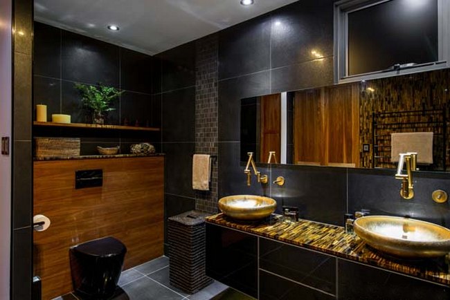 - Die luxuriöse Aussicht hat eine Kombination aus einer schwarzen Toilettenschüssel mit goldenen Wänden. Mit Hilfe von dunklen Holzmöbeln und Accessoires, die Gold nachahmen, können Sie ein luxuriöses Interieur im Badezimmer oder in der Toilette schaffen.