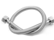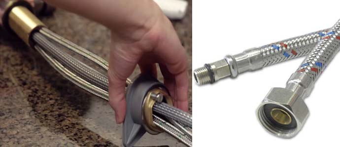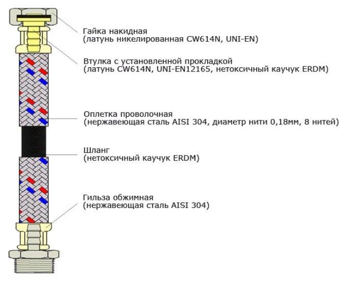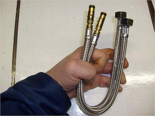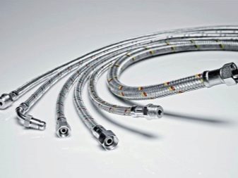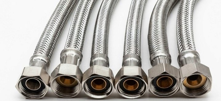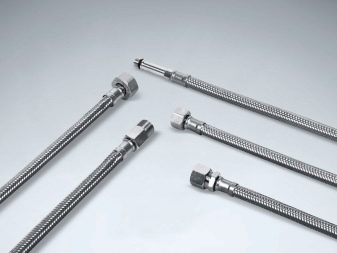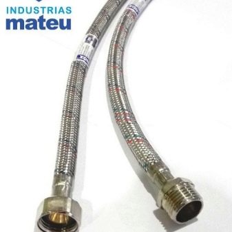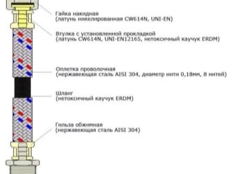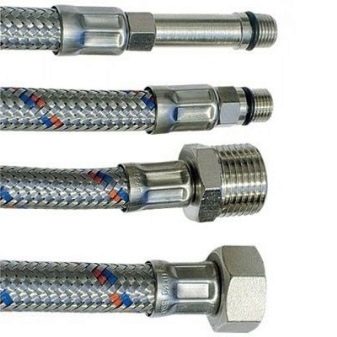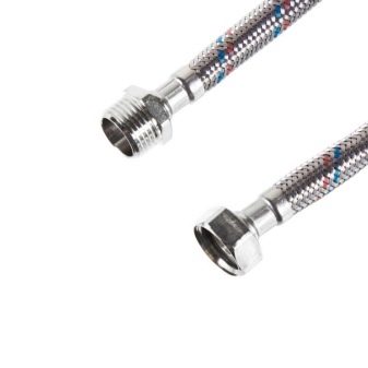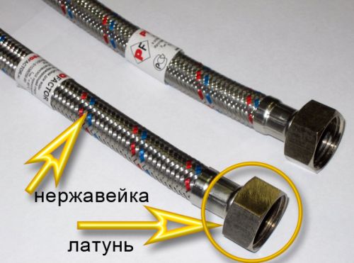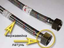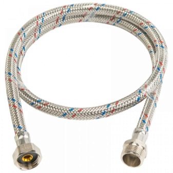 Eine der beliebtesten Arten von flexiblen Liner ist verstärkte Liner. Es besteht aus zwei Teilen: dem inneren Gummischlauch und dem äußeren Stahlmantel. Schläuche unterschiedlicher Länge werden mit Stahl einer bestimmten Farbe umwickelt (blau für kaltes Wasser und rot für heiß), Armaturen oder Muttern mit Gummidichtungen sind an den Enden angebracht.
