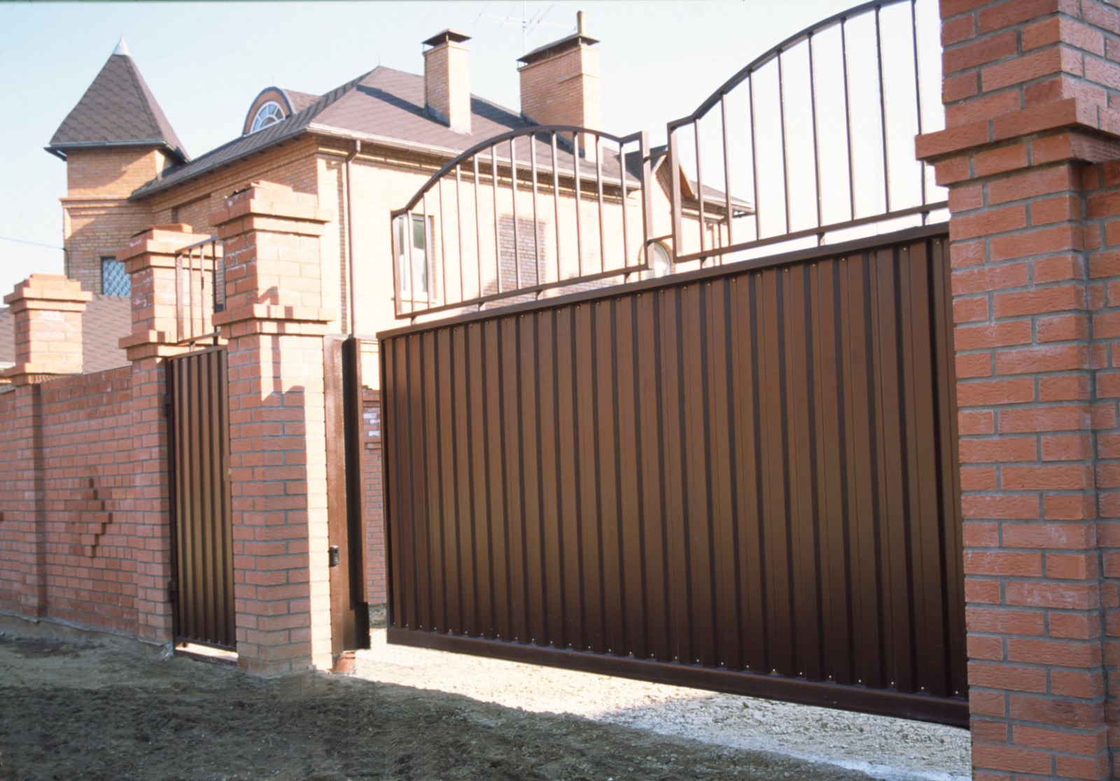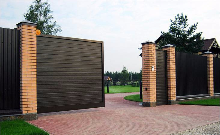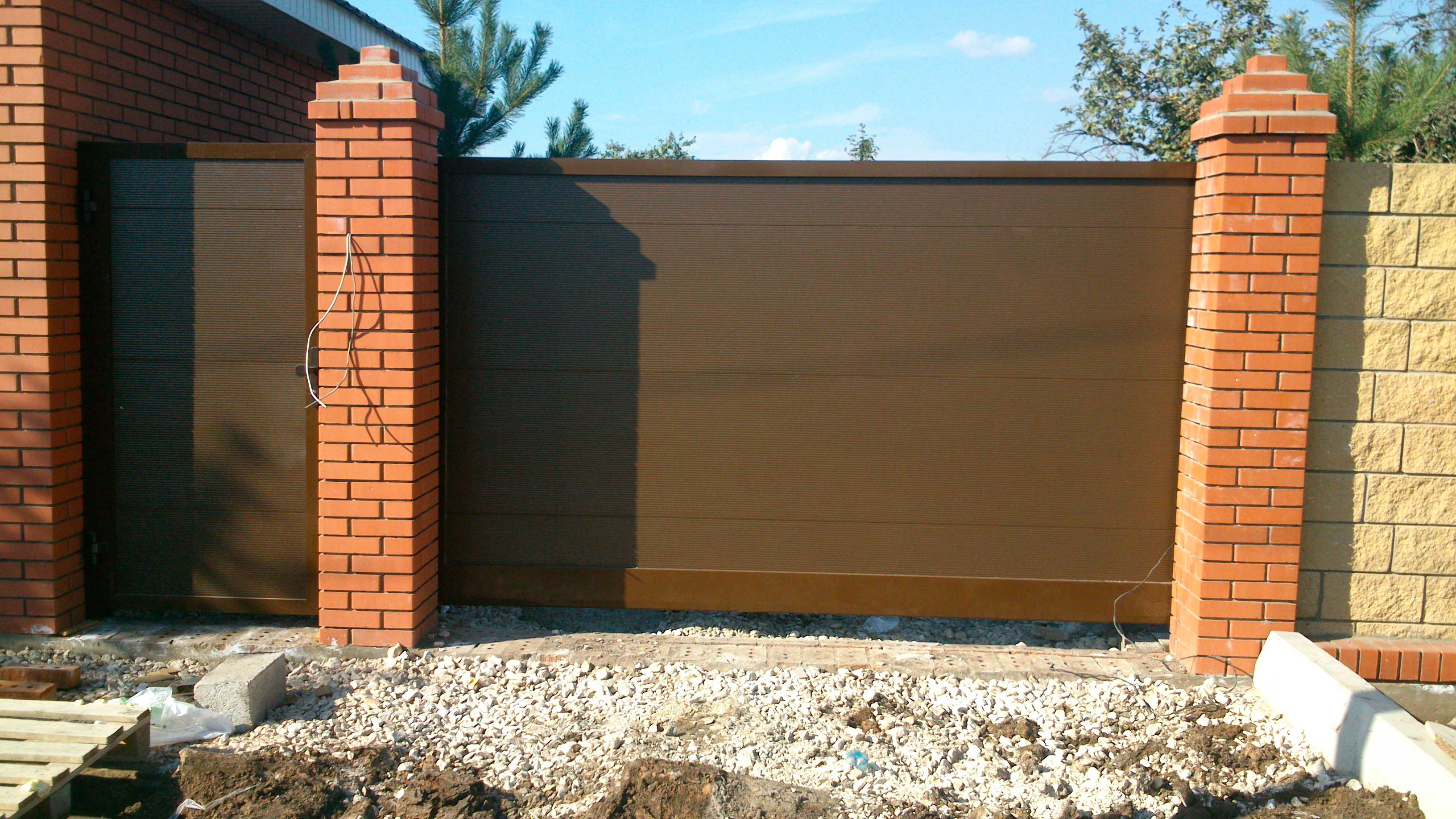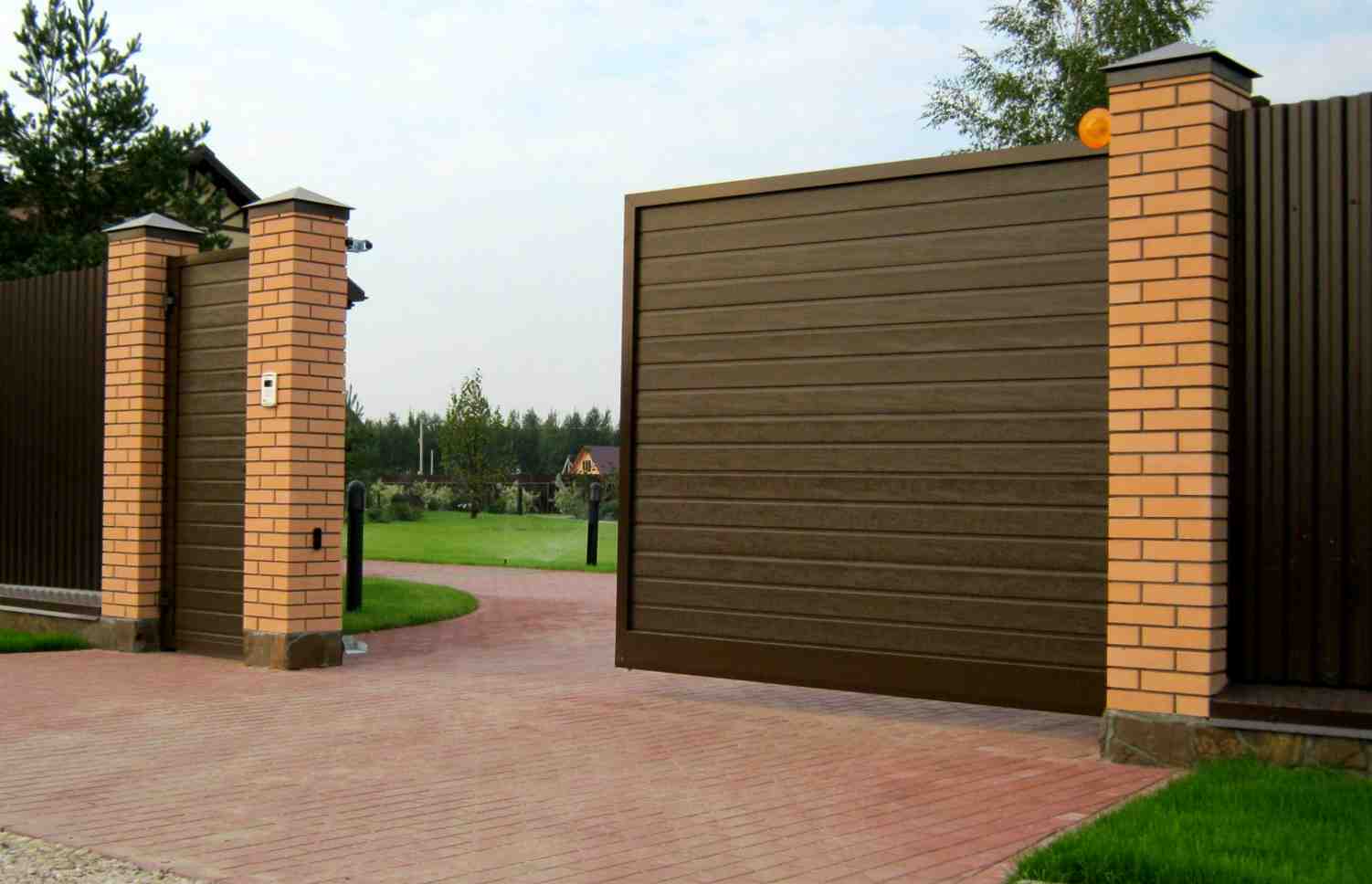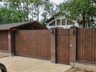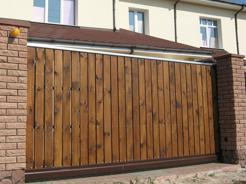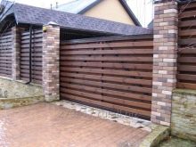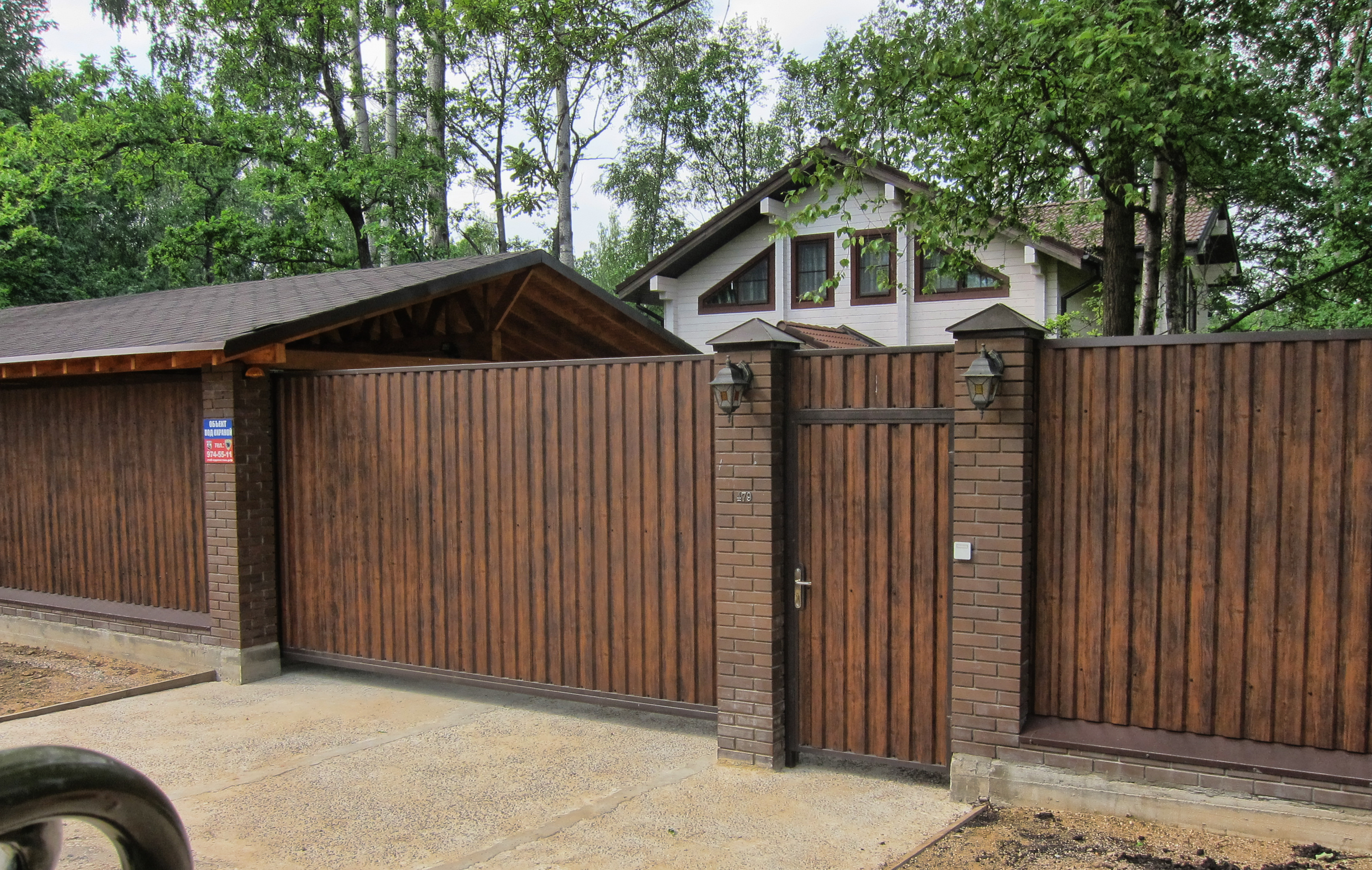 Ein interessantes und gastfreundliches Aussehen ist ein Schiebetor und Tor, dekoriert mit dunkelbraunem und leicht grobem Holz. Diese Strukturen können zusammen mit einem Backsteinzaun aus gelben Ziegelsteinen und roten Backsteinpfeilern sicher installiert werden.