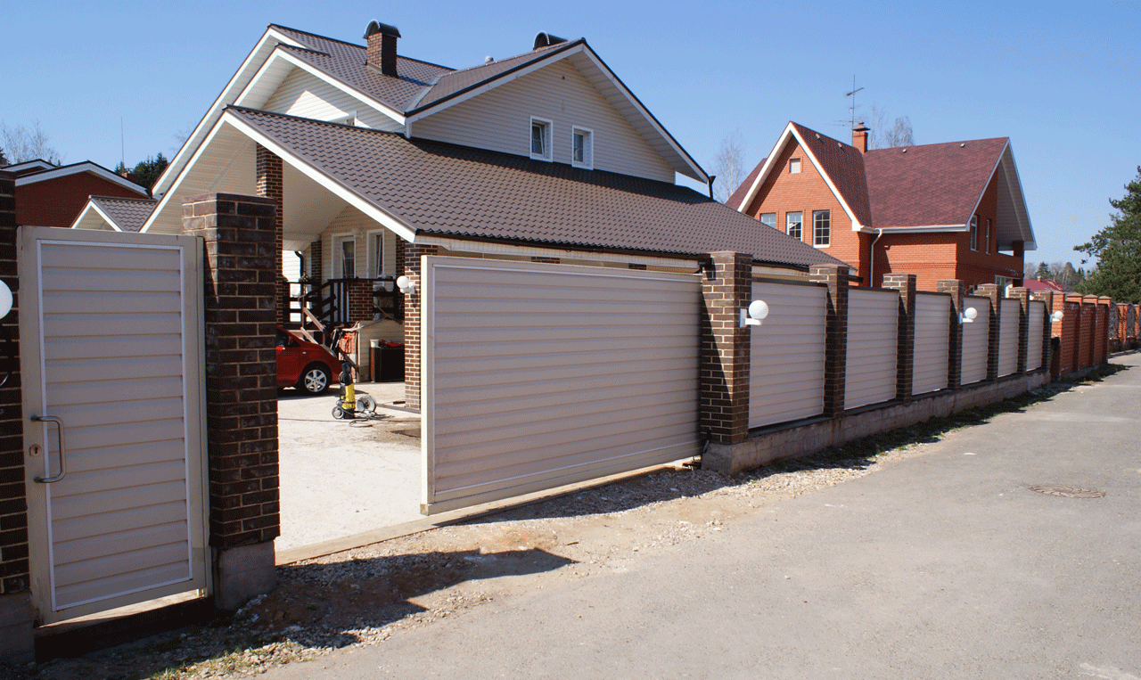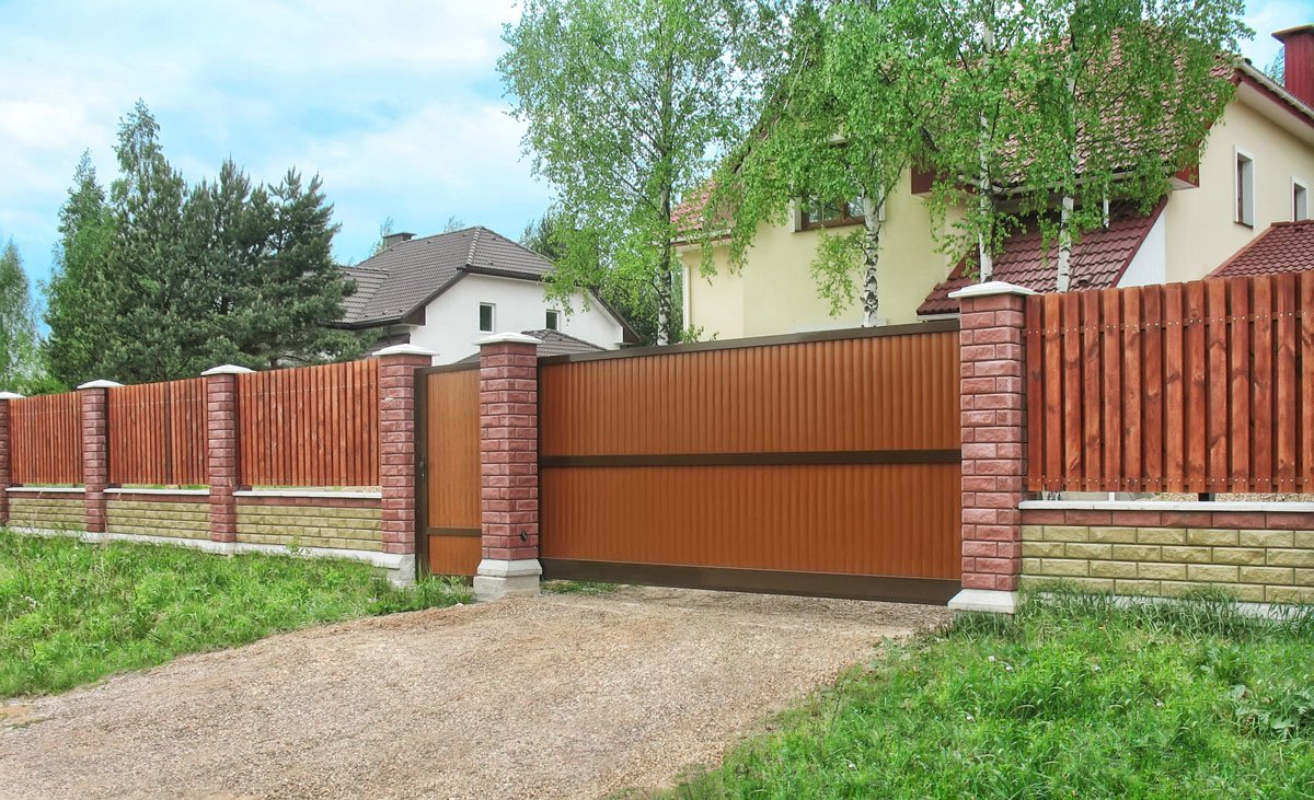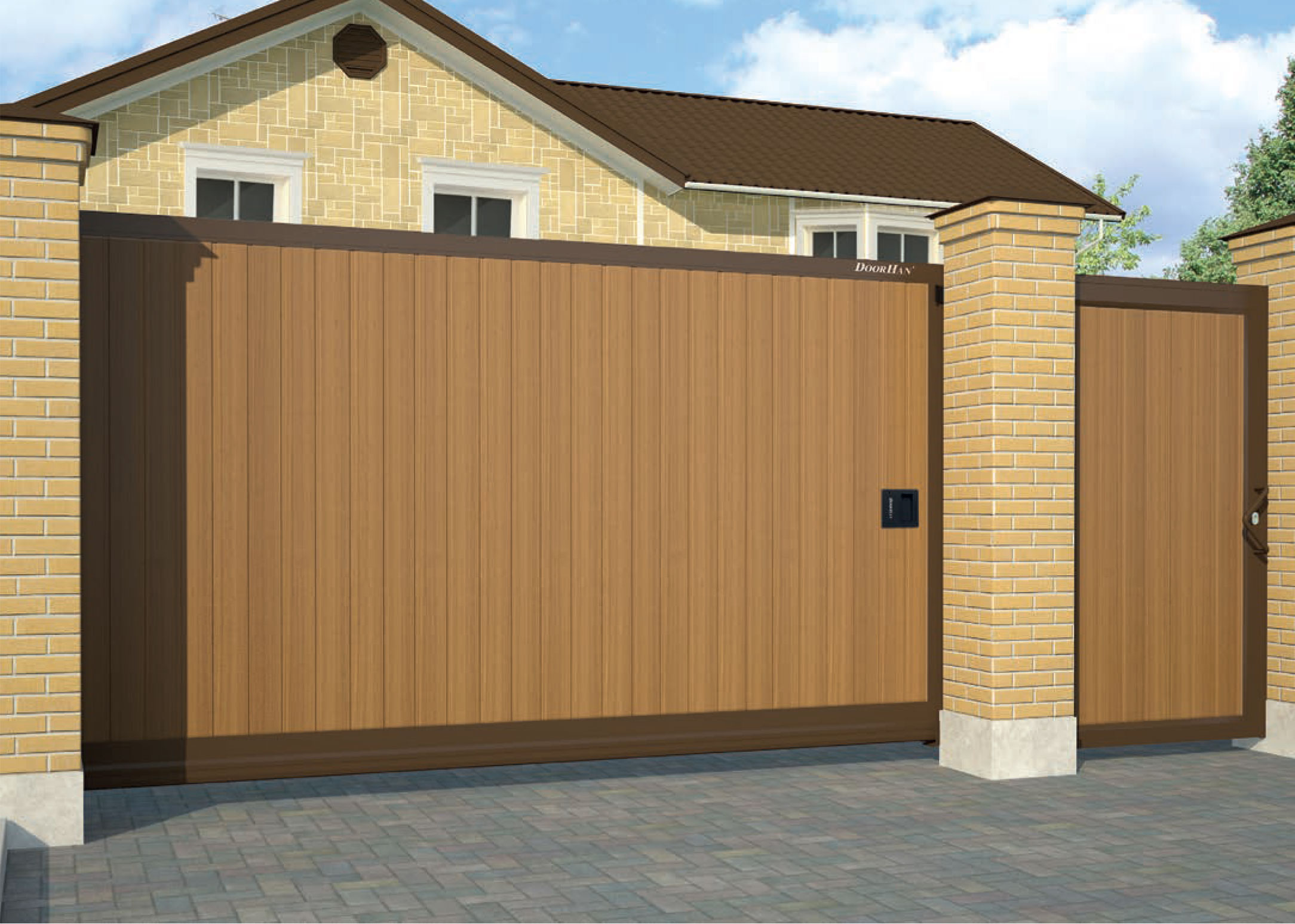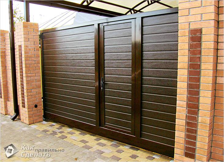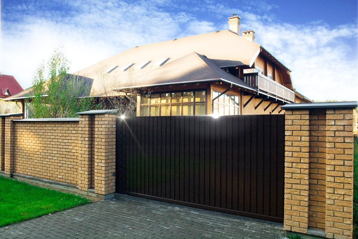 Ein interessantes und gastfreundliches Aussehen ist ein Schiebetor und Tor, dekoriert mit dunkelbraunem und leicht grobem Holz. Diese Strukturen können zusammen mit einem Backsteinzaun aus gelben Ziegelsteinen und roten Backsteinpfeilern sicher installiert werden.