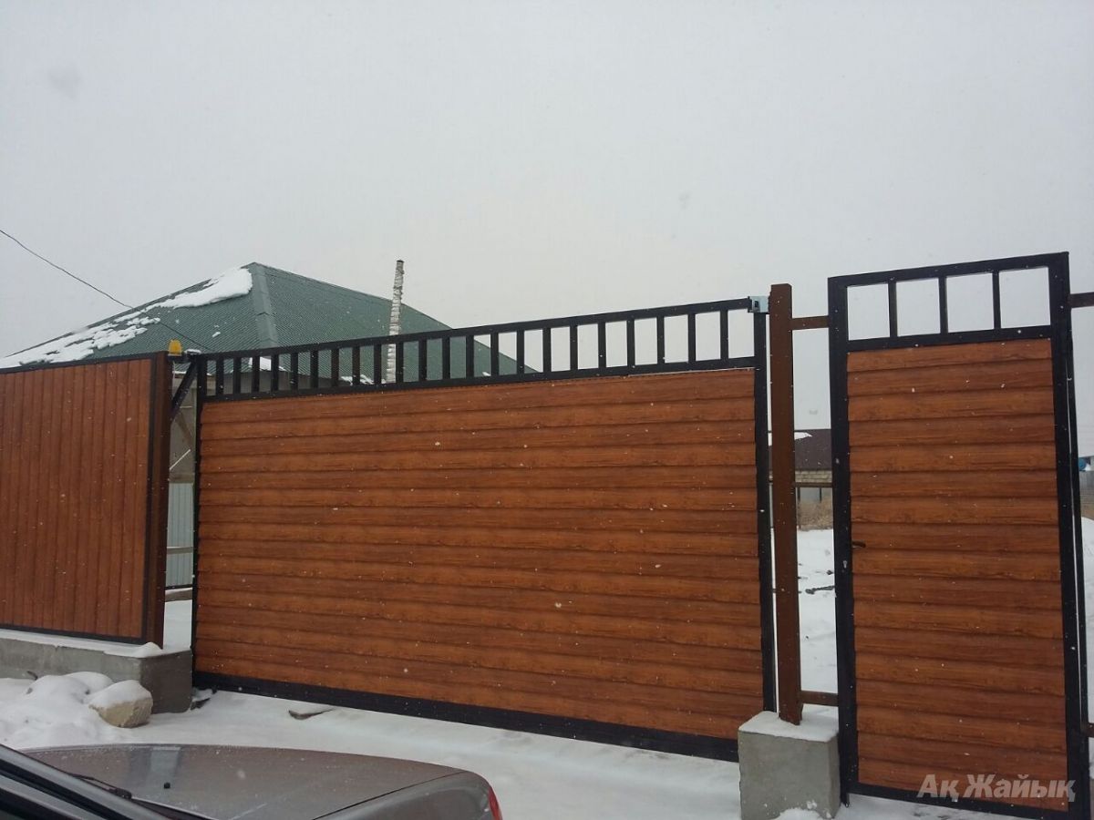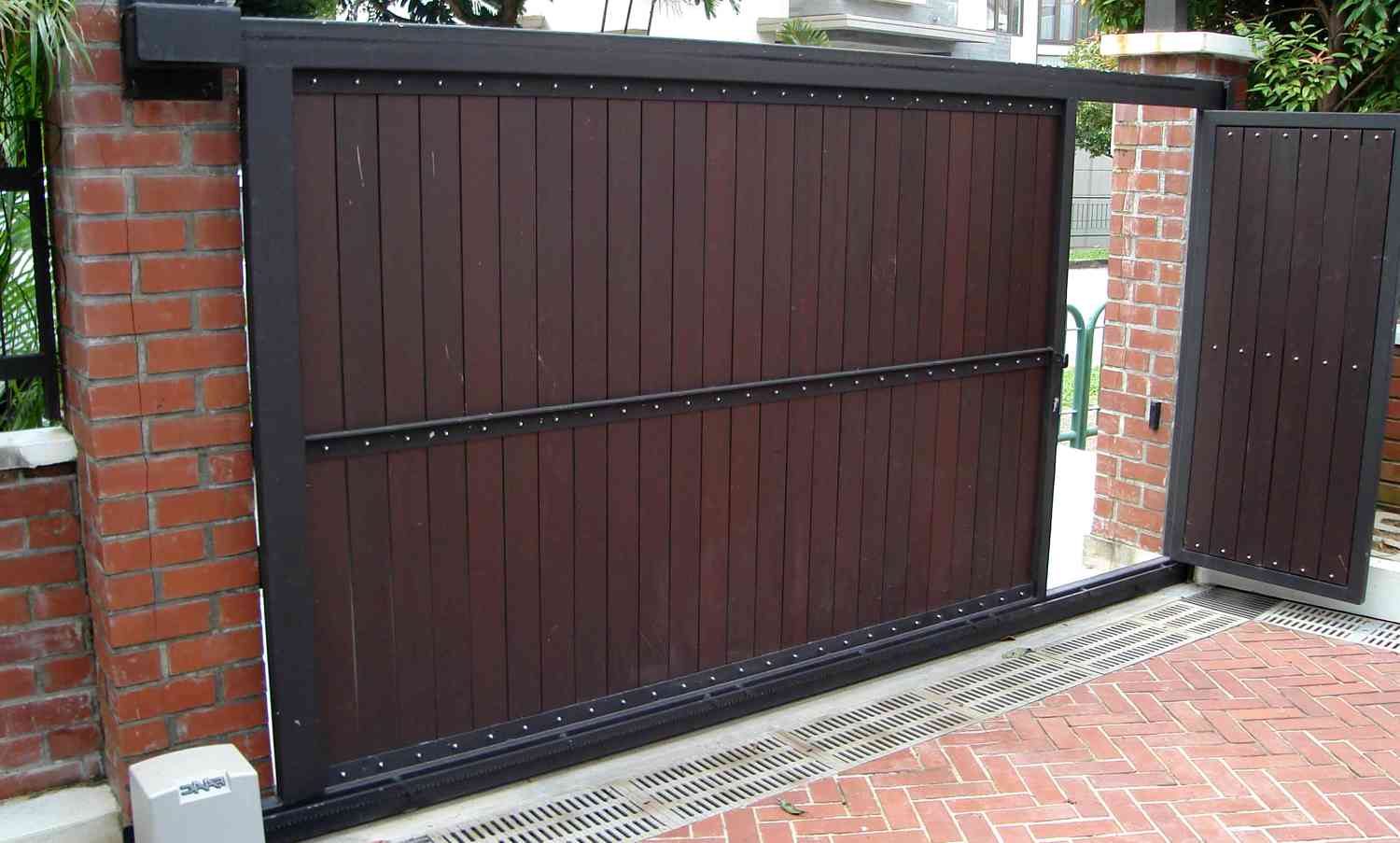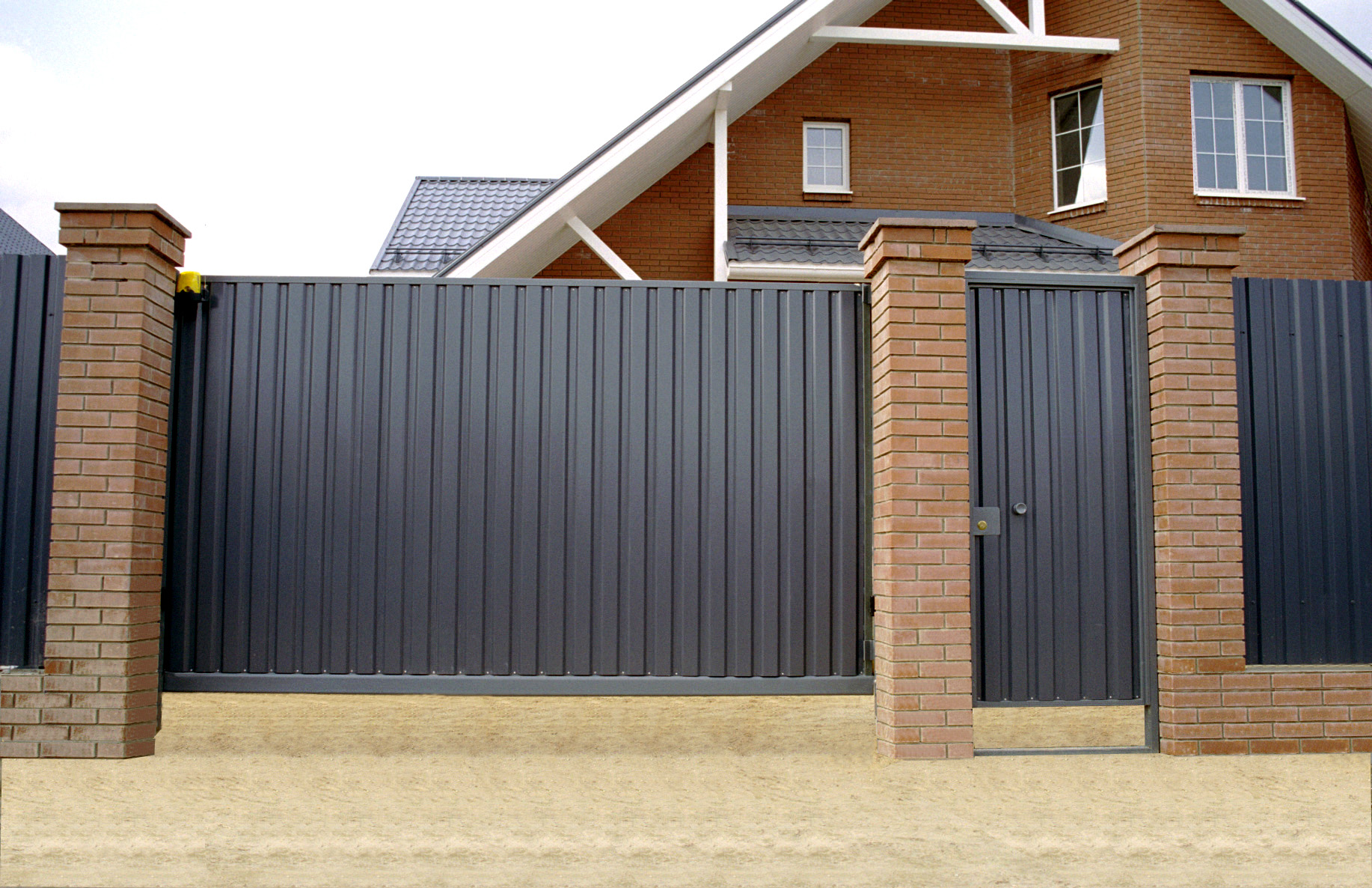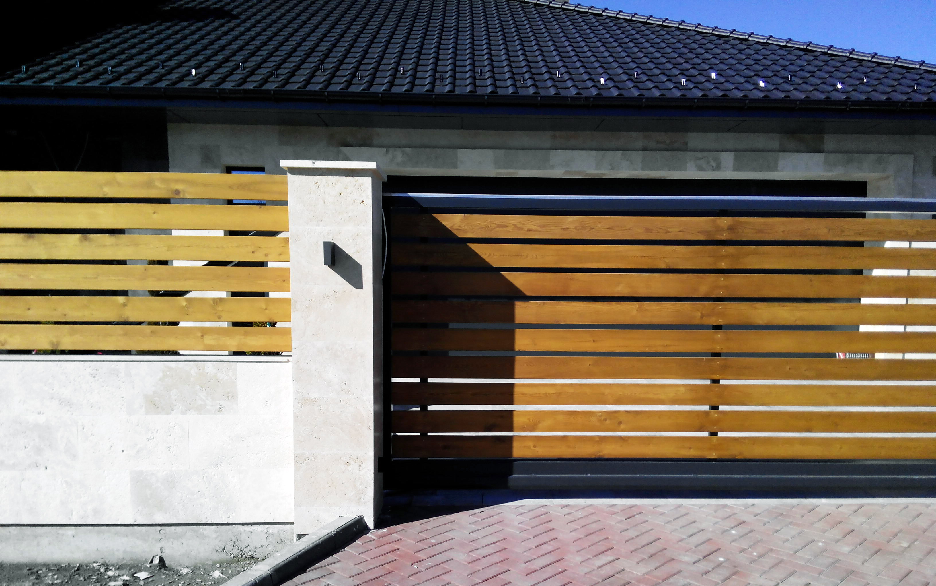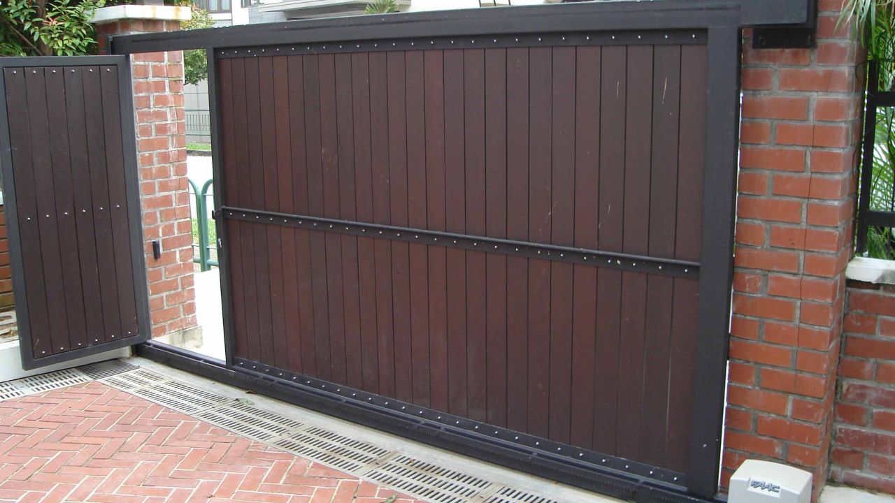 Ein interessantes und gastfreundliches Aussehen ist ein Schiebetor und Tor, dekoriert mit dunkelbraunem und leicht grobem Holz. Diese Strukturen können zusammen mit einem Backsteinzaun aus gelben Ziegelsteinen und roten Backsteinpfeilern sicher installiert werden.