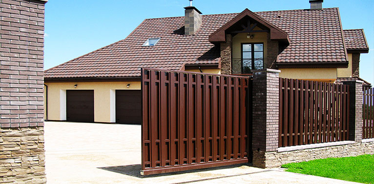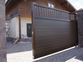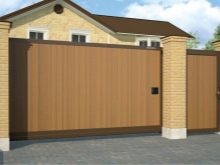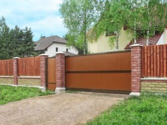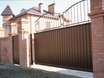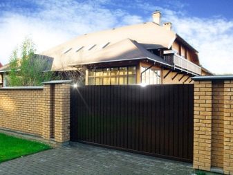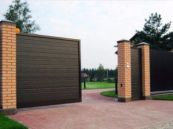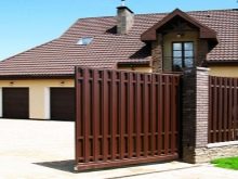 Schiebetore in Form eines Schattiers in Schokooptik sehen wunderschön und sauber aus. Diese Leinwand kann mit einem dunkleren Zaun in einem ähnlichen Design kombiniert werden. Die Säulen und Sockel dieser Strukturen sind meistens mit dekorativen Mauerwerk verkleidet. Solche Lösungen sehen stilvoll und harmonisch aus, besonders wenn kleine Bäume in ihrer Nähe sind.