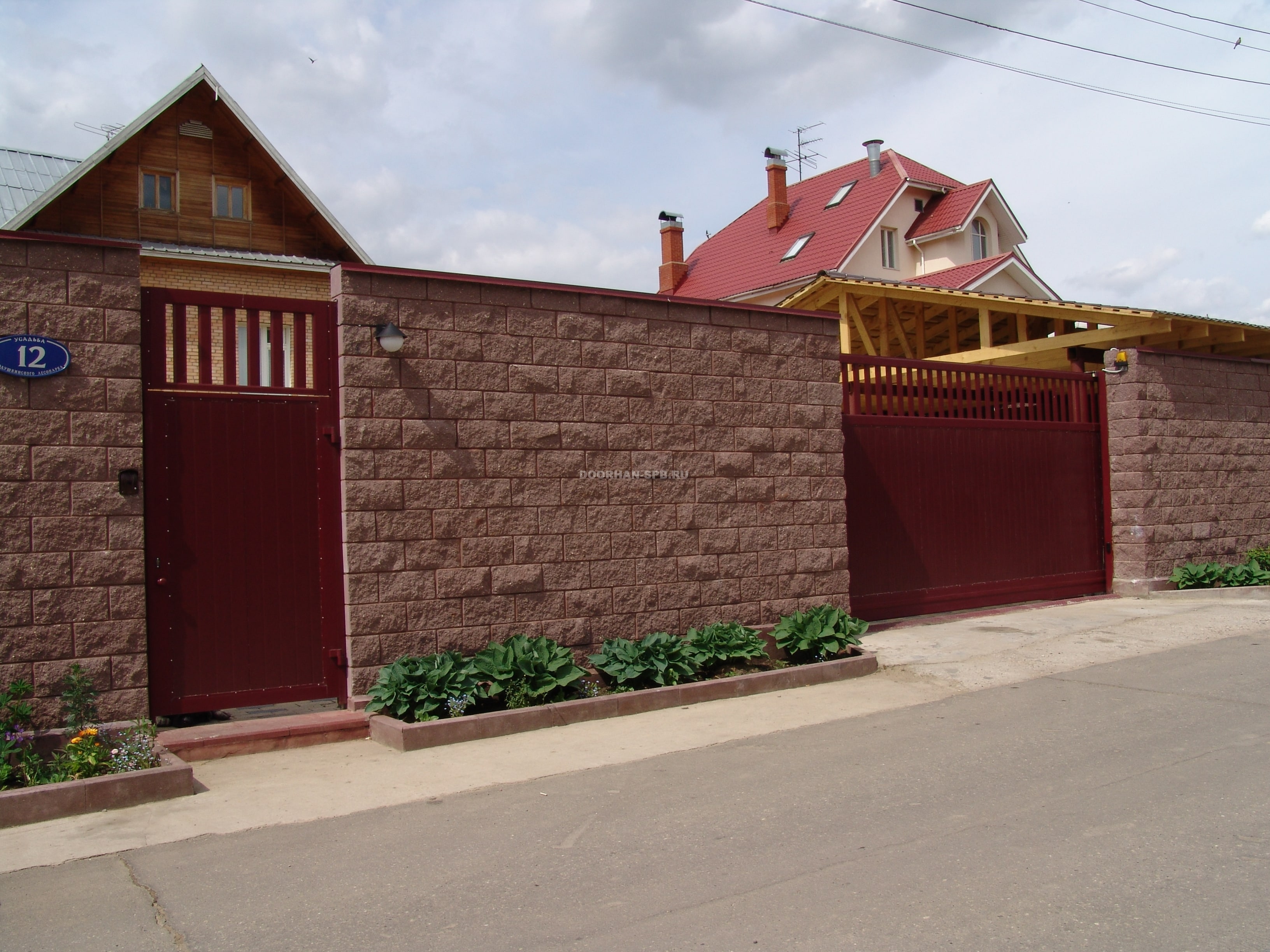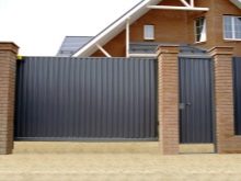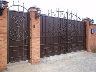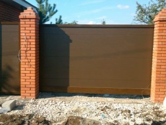 Zwischen den Säulen der Basis, die mit dekorativem oder Naturstein getrimmt sind, wird es ein solides braunes Tor mit einer teilweise offenen Spitze sehen. Hängen Sie an einen der Posts einen Briefkasten mit der gleichen Farbe wie die Leinwand an. Ein solches Design wird auf dem Hintergrund von hellen Pflastersteinen besser aussehen.
