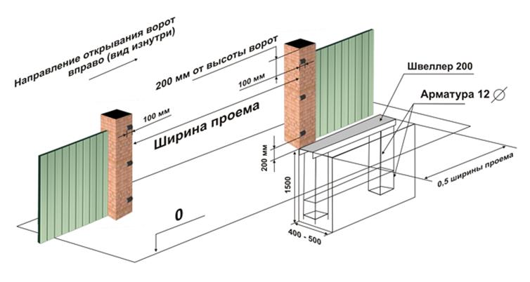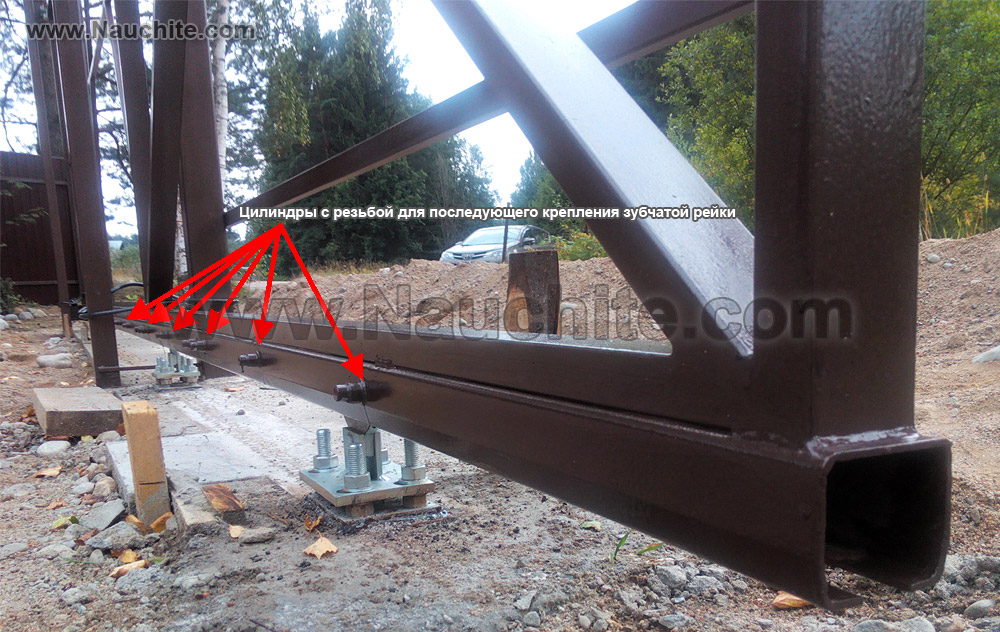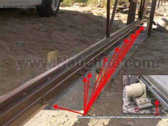 Als nächstes sollten Sie mit der Herstellung des Metallteils der Schiebetore beginnen. Hierfür ist ein Metallkanal nützlich (seine Breite sollte 14-15 cm betragen und die Länge sollte der Länge des Fundaments entsprechen). Danach sollten kleine Metallbeine mit einem Durchmesser von 13 mm an die Kanalschiene geschweißt werden. Dann muss das Metallteil in den ausgegrabenen Graben (Beine nach unten) gelegt und betoniert werden.
