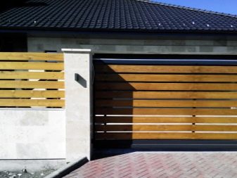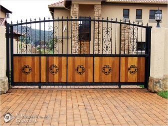 Wenn Sie elegante und reiche Bilder mögen, dann sollten Sie auf die schicken Kombitore achten. Zum Beispiel kann es ein einfaches und monochromes schwarzes Schild sein, ergänzt mit einem schmiedeeisernen Gitter auf der Oberseite und umgeben von einem hellen Holzzaun mit einem Backsteinrahmen.