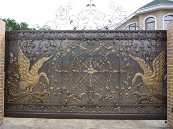 Liebe die reichen und pompösen Lösungen? Dann sollten Sie luxuriöse Tore aus dunkler Schokolade oder schwarz mit geschmiedeten Geweben und goldenen Ornamenten in Form von Löwen wählen oder bestellen.Es ist empfehlenswert, solche originellen Konstruktionen vor dem Hintergrund der hellen Säulen des Zaunes und des Hauses mit der gelben oder weißen Fassade zu verwenden.