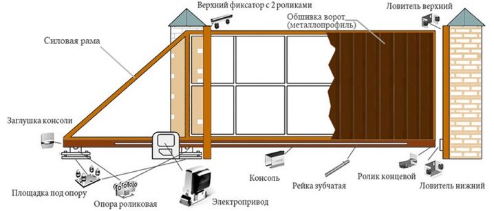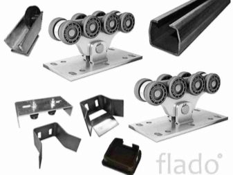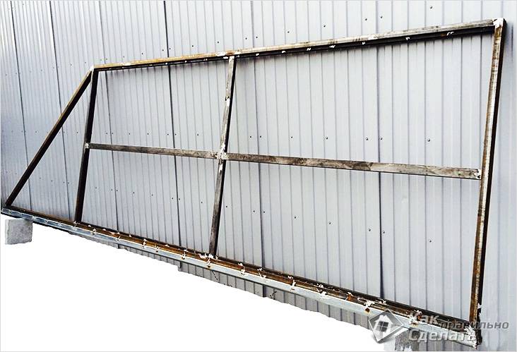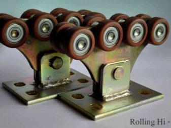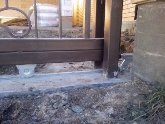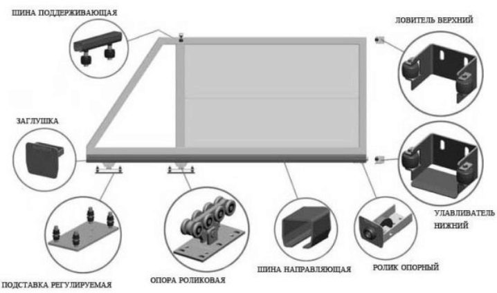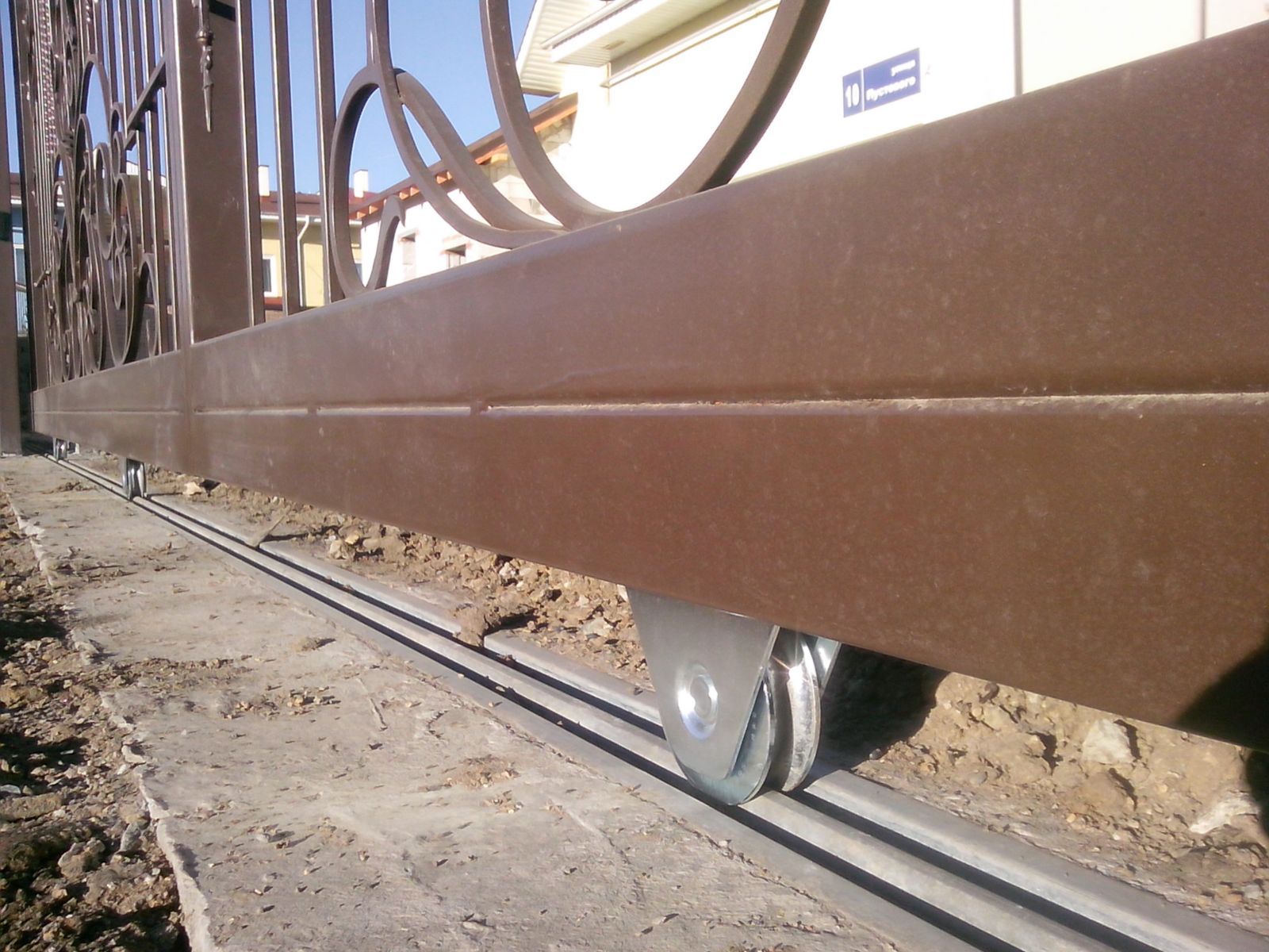 Schienentore haben ein einfaches Design. In ihnen bewegt sich die Klappe entlang der Schiene, die sich entlang der Öffnungslinie im Boden befindet. Im unteren Teil geschweißte Rollen spielen die Rolle eines Bahnträgers.