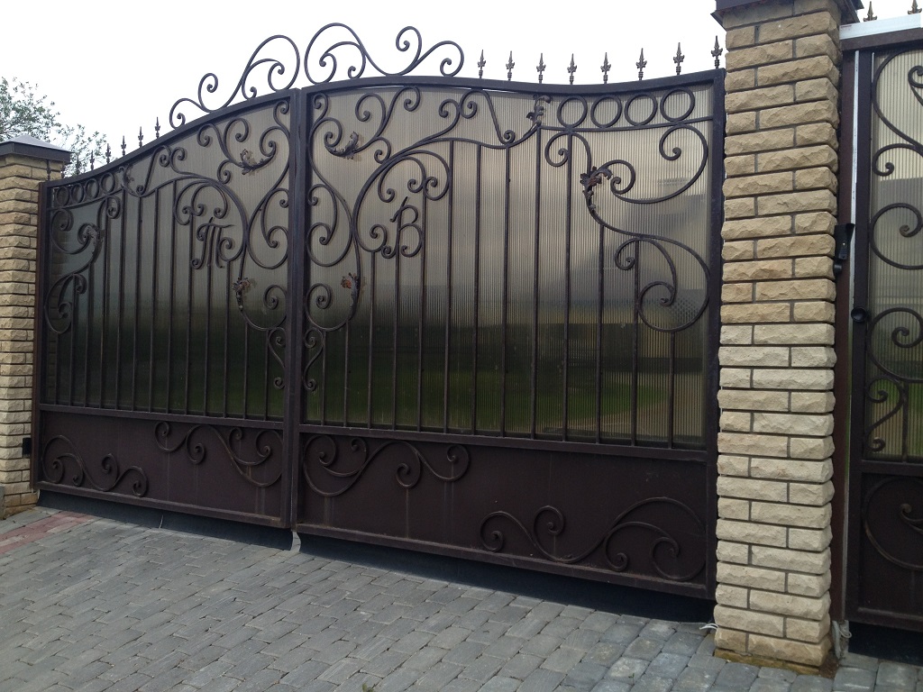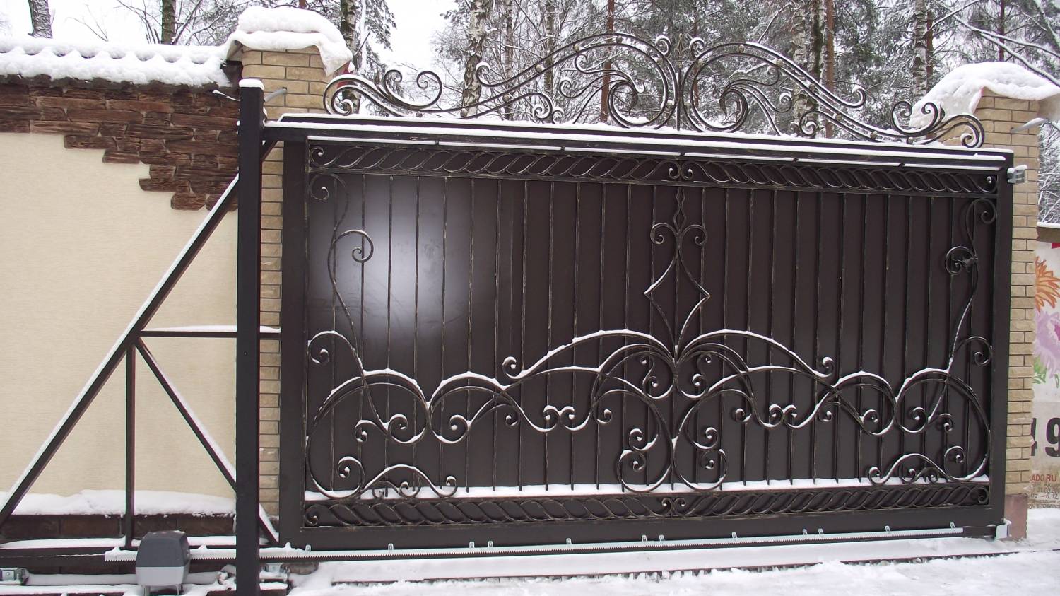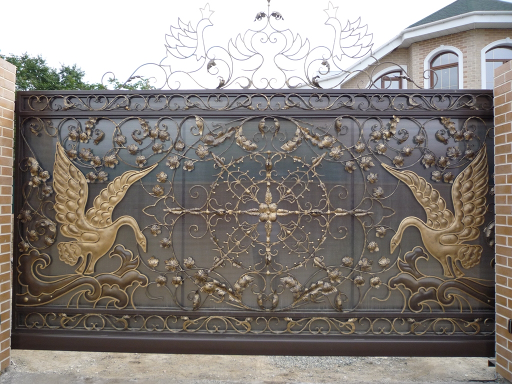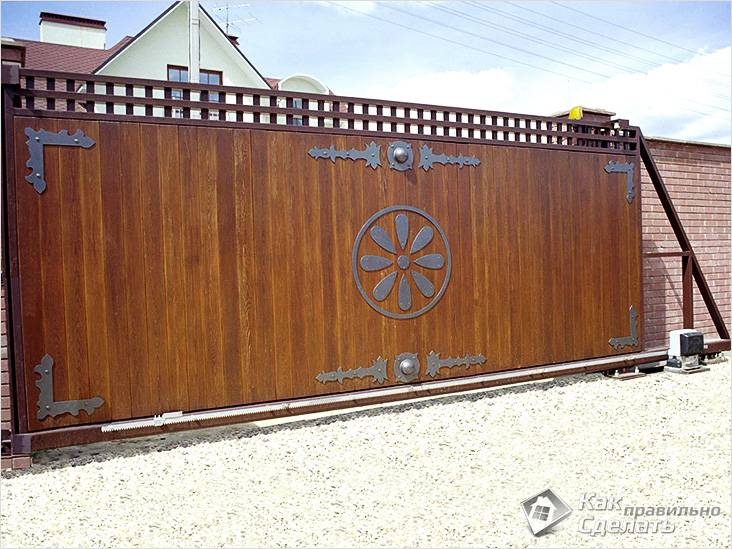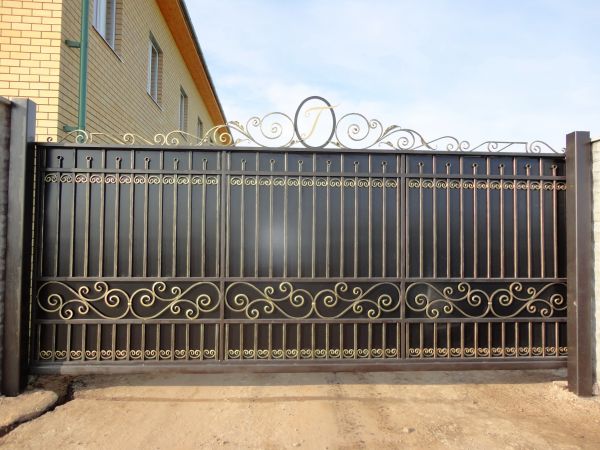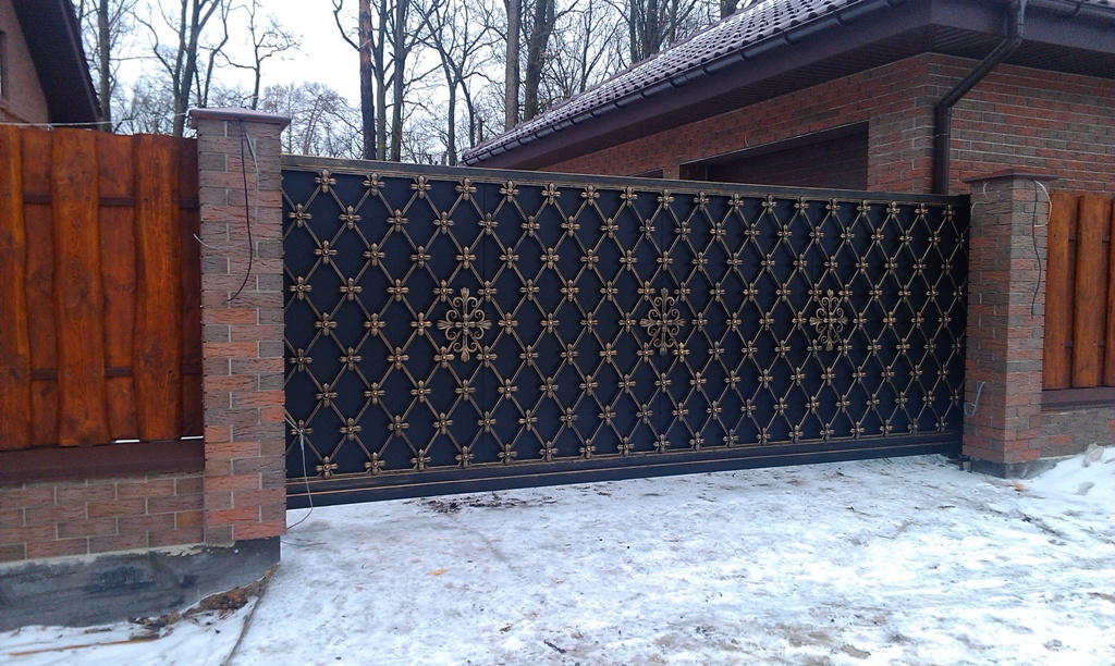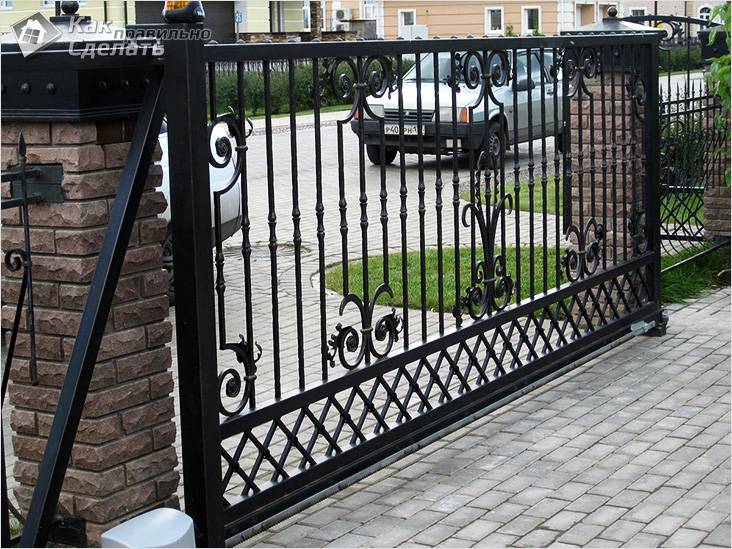 - Schmieden.Geschmiedete Teile können aus einem einfachen Schiebetor ein Kunstwerk machen. Der Hauptnachteil solcher Produkte ist ihr hoher Preis. Nicht jeder Verbraucher kann sich solch ein "Vergnügen" leisten.