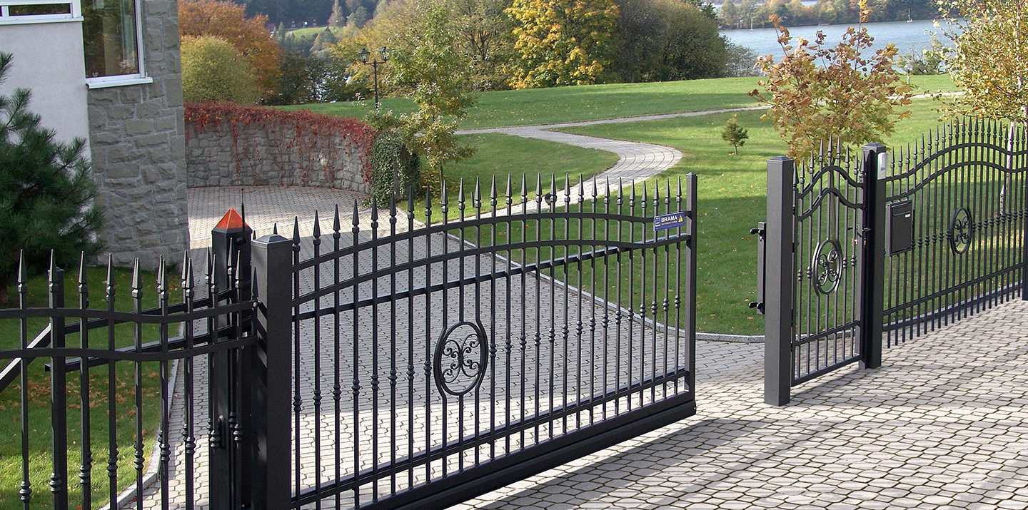 Die Tore wirken besonders harmonisch, ergänzt durch passende Straßenleuchten. Wenn zum Beispiel ein geschmiedetes Gitter auf dem Schild ist, dann werden geschmiedete Lampen mit eleganten Linien organisch daneben aussehen (auf dem Zaun).