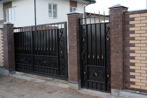 Wenn Sie luxuriösere und teurere Optionen bevorzugen, dann sollten Sie spektakuläre schwarze Tore mit einem schmiedeeisernen Gitter einbauen und neben ihnen das gleiche dunkle Tor mit einem golden gemusterten Schmiedestück und spitzen Spitzen an der Spitze in den Zaun bauen. Solche Produkte werden in einem Ensemble mit einem Ziegelzaun von Rot- und Sandfarbe gut aussehen.