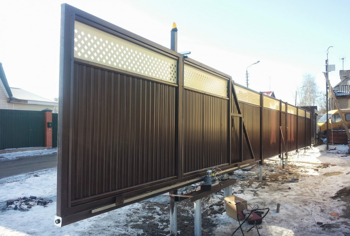 Einziehbare Tore können mit verschiedenen Ausrüstungsmaterialien ergänzt werden. Zum Beispiel kann es eine ordentliche vertikale Kiste, saubere Folie, spektakuläre Kunst Schmieden und viele andere Elemente sein. Moderne Verbraucher stehen vor einer großen Auswahl an Designs.Es kann traditionelle Optionen aus einem Sandwich-Paneele oder ein professionelles Blatt aus verschiedenen Blumen sein.