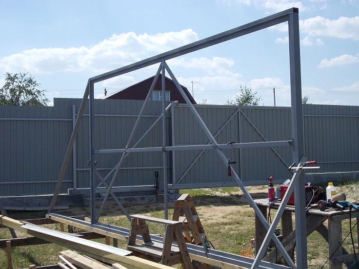 Nach dem Auftragen und Trocknen der Grundierung können Sie mit dem Garprozess des Rahmens fortfahren. Hierfür ist eine Schiene mit einer Länge von 6 m sinnvoll, die so platziert werden muss, dass der Schnitt nach unten zeigt. Dann sollte ein Profilrohr daran angeschweißt werden. Seine Größe sollte 60x30x2 mm betragen. Weiter sind auf diesem Rohr vertikale Gestelle installiert und auch verschweißt. Diese Teile müssen gleich groß sein.