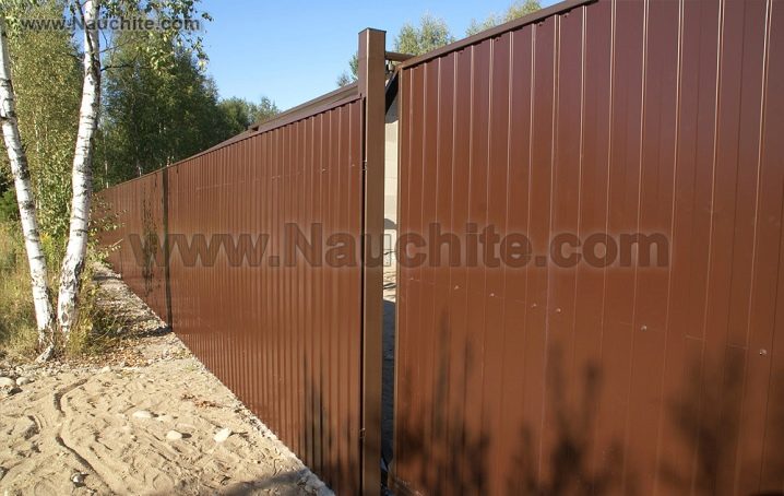 Eine ausgezeichnete Lösung für das Geben ist ein billiger Zaun mit einem profilierten Blatt oder einem Gartenzaun von einer angenehmen braunen Farbe. Solche Konstruktionen sehen in der Regel nicht auffällig aus und sind sehr häufig anzutreffen.