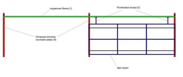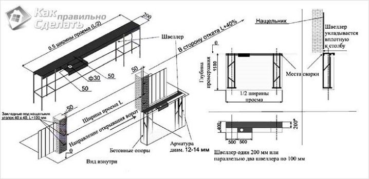 An der Basis dieser Strukturen befindet sich ein spezieller Konsolen - Kanal. Es sorgt dafür, dass das Türblatt offen oder geschlossen gehalten wird. Um das Gewicht der Leinwand auszugleichen, beträgt die Länge des Führungsbalkens üblicherweise das 1,5-fache der Breite der Öffnung.
