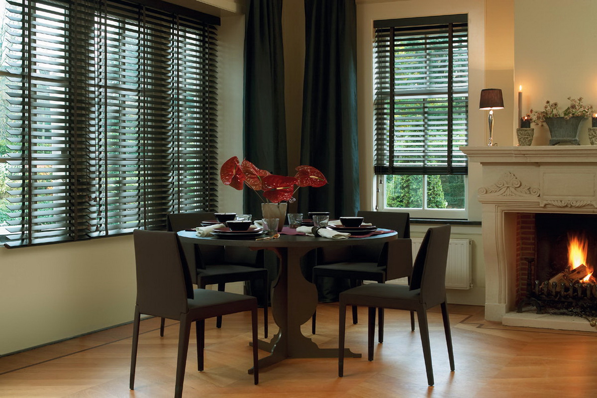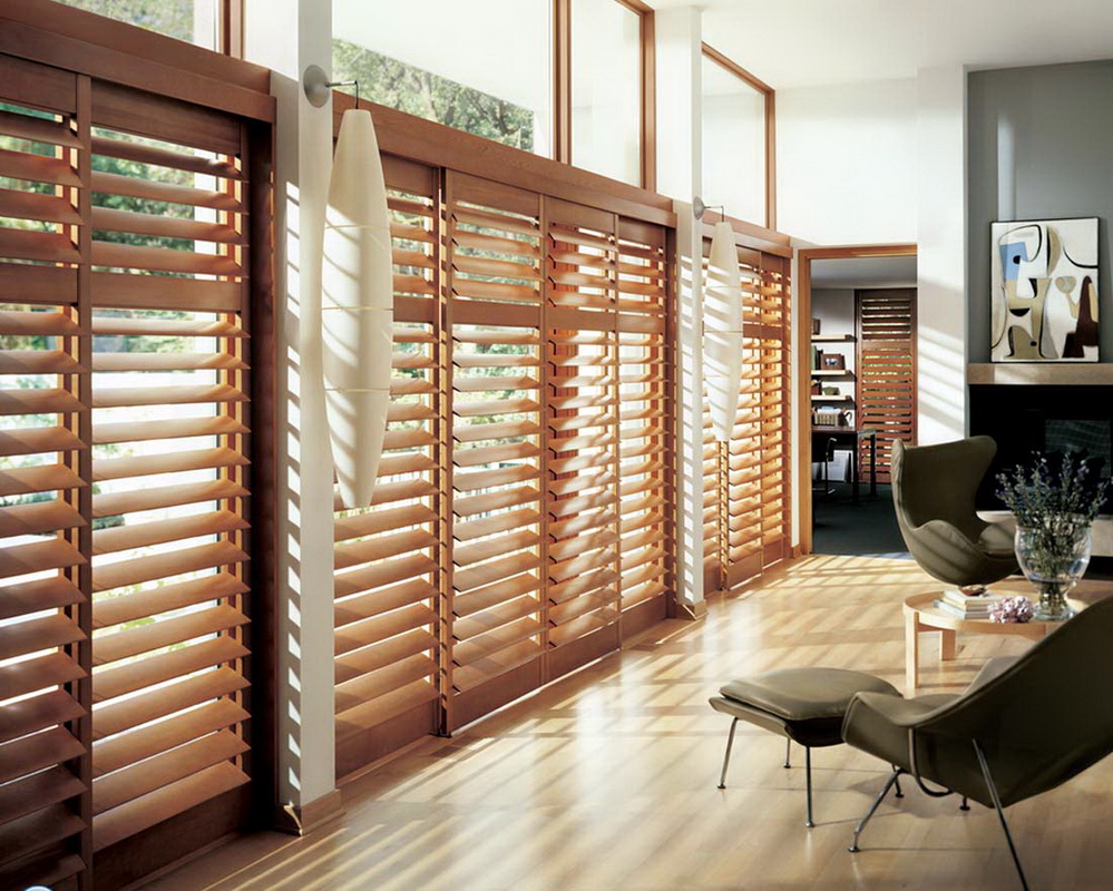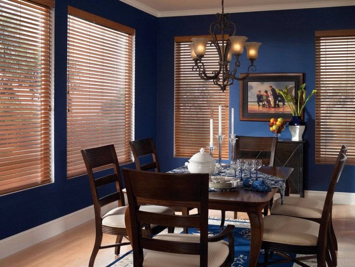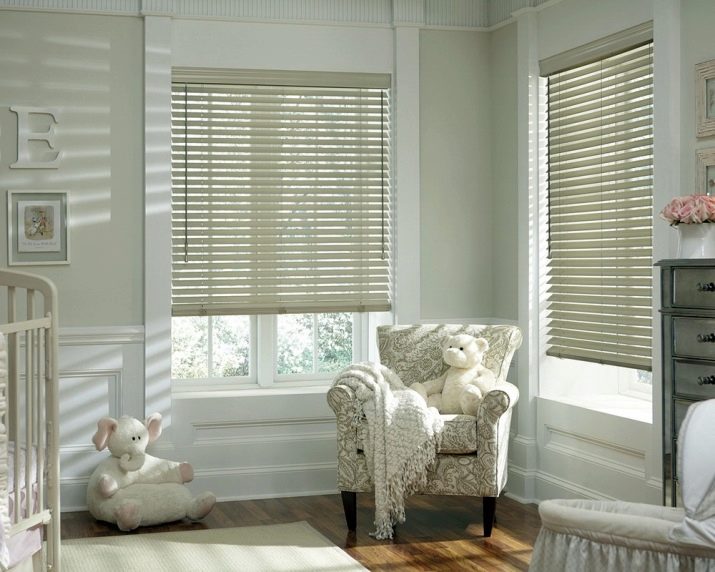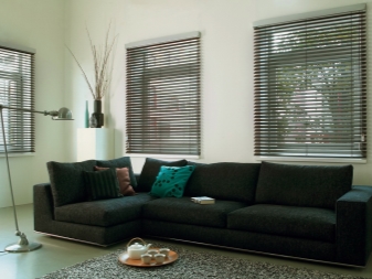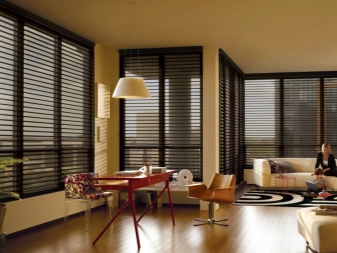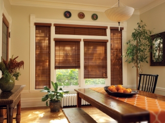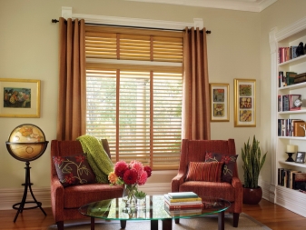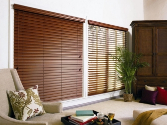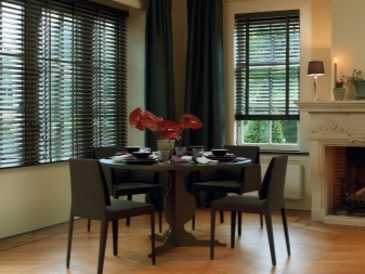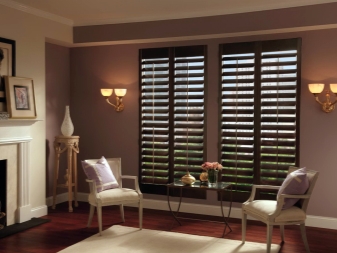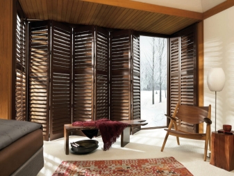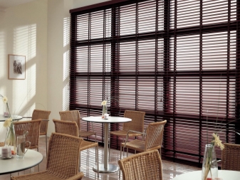 Holzjalousien sind ein gutes Detail der Einrichtung, nicht nur für die Einrichtung von Wohnzimmern, sondern auch für Büros oder Büros. Sie können die Designidee wie im Design eines klassischen und modernen Interieurs ergänzen.
