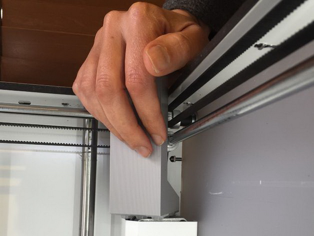 - Als nächstes müssen Sie die obere Schiene in die Klammern einfügen. In diesem Moment sollte ein unverwechselbares Klicken zu hören sein. Natürlich müssen Jalousien in der geschlossenen Form fixiert werden.