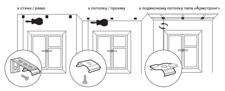 - Zur Montage sollten seitliche Halterungen an den vorgefertigten Markierungen angebracht werden. Es ist außerhalb der Tür und dementsprechend der offene Teil an der inneren Oberfläche des Fensters platziert.