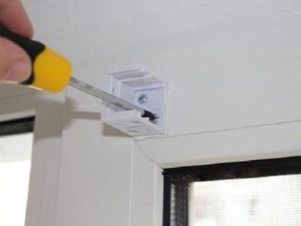 - Wenn die Klammern geschraubt sind, hängen sie ein Gesims. Es kann auf verschiedene Arten behoben werden. Am bequemsten ist der Mechanismus für selbstverriegelnde Schlösser. Einfachere Produkte müssen mit Schrauben oder Schrauben am Rahmen verschraubt werden.