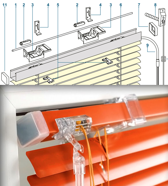 Die Traufe ist die Basis der gesamten Struktur, auf der die Lamellen befestigt sind. Slider werden kleine Plastikgeräte genannt, die den Bändern helfen, sich zu bewegen. Gewichte werden benötigt, um das Gewicht der Lamellen zu erhöhen. Mit ihnen schwingen sie nicht von einer Seite zur anderen. Cord-Management ermöglicht es Ihnen, das Band zu erweitern, drücken und verbinden Sie sie.