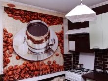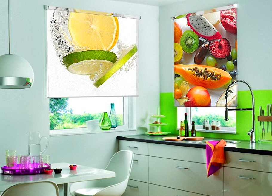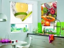 In der Küche ist es besser, Holz-, Aluminium- oder Kunststoffmodelle anzuordnen, da sie praktischer sind als Stoffgegenstücke. Um diesen Raum zu dekorieren, verwenden Sie Drucke mit Stillleben oder Farben, um den Appetit zu stimulieren.