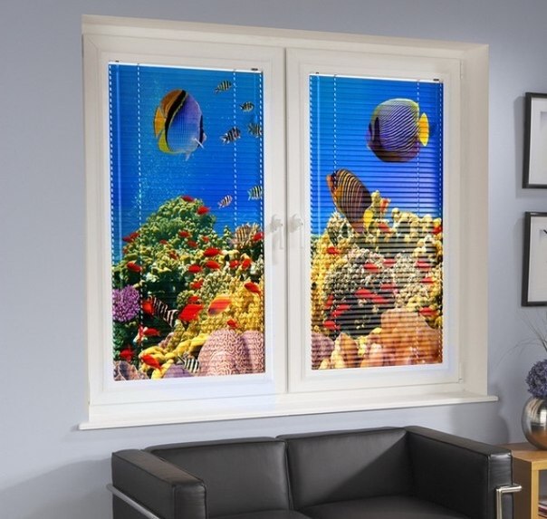 Um eine Fensteröffnung zu verzieren, ist es möglich, gewöhnliche Vorhänge und Vorhänge zu verwenden, es ist möglich, Jalousien mit einem Fotodruck aufzutragen.