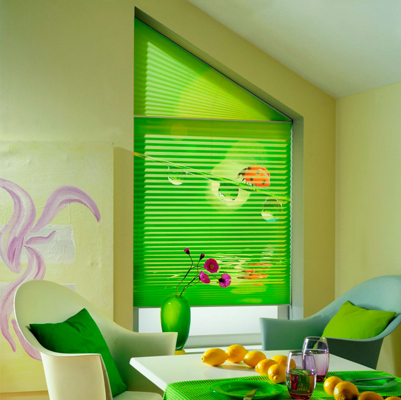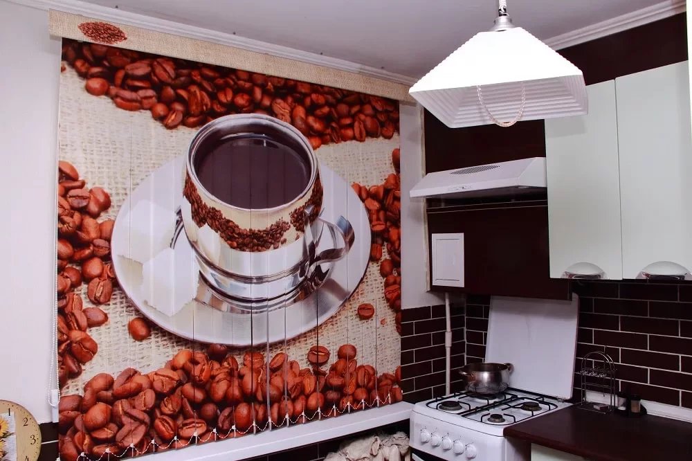 Die Hintergrundfarbe und der Druck, der auf die Jalousien aufgetragen wird, sollten in der Gestaltung des Raumes harmonisch aussehen.