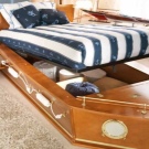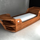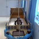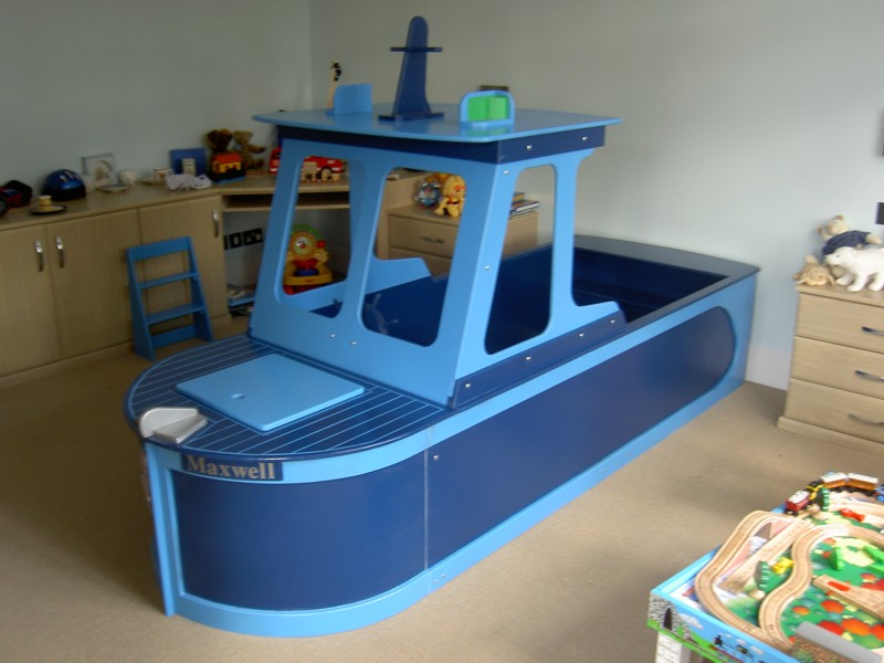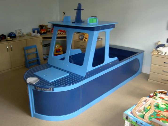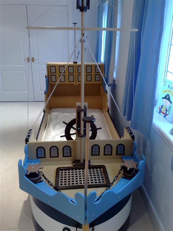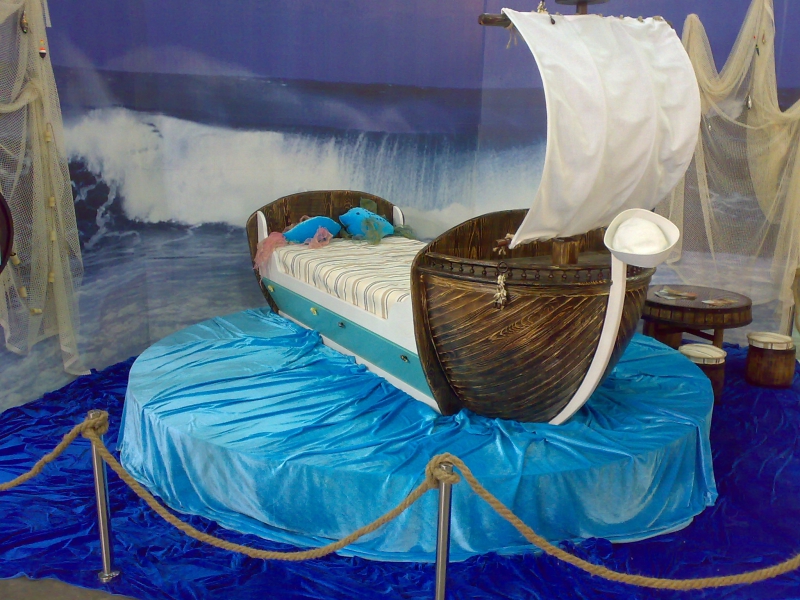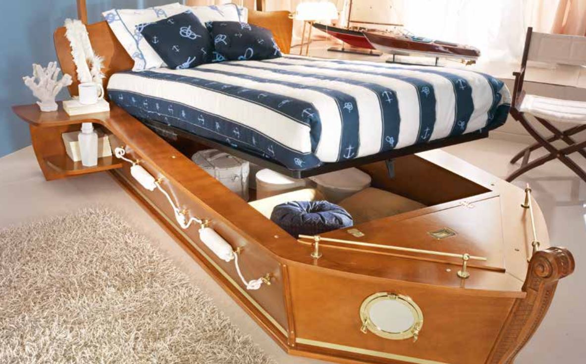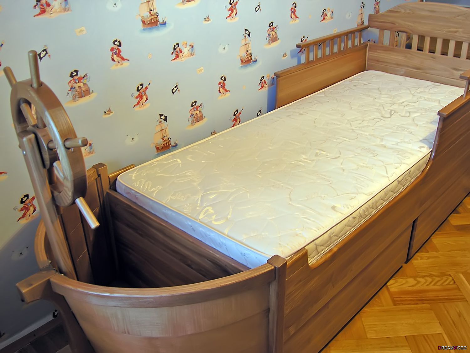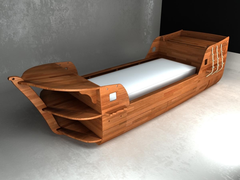 Un navire exotique avec un volant indépendant, des étagères à l'avant, des jantes confortables et des tiroirs au bas montre un magnifique exemple de fantaisie de designer sur un thème nautique. Ce lit peut être la base pour créer le style de la pièce entière.décoré dans l'esprit d'aventure ou de pirate. Marron, bleu et bleu marine, céladon, or et blanc sont les couleurs primaires de ce thème.