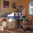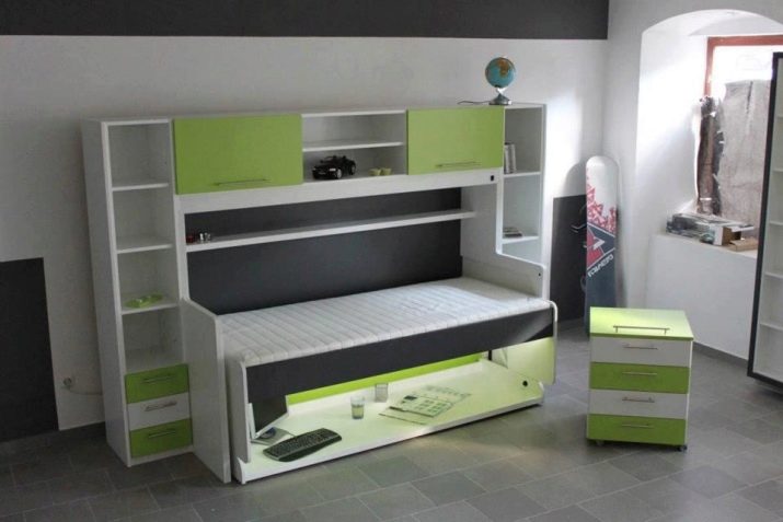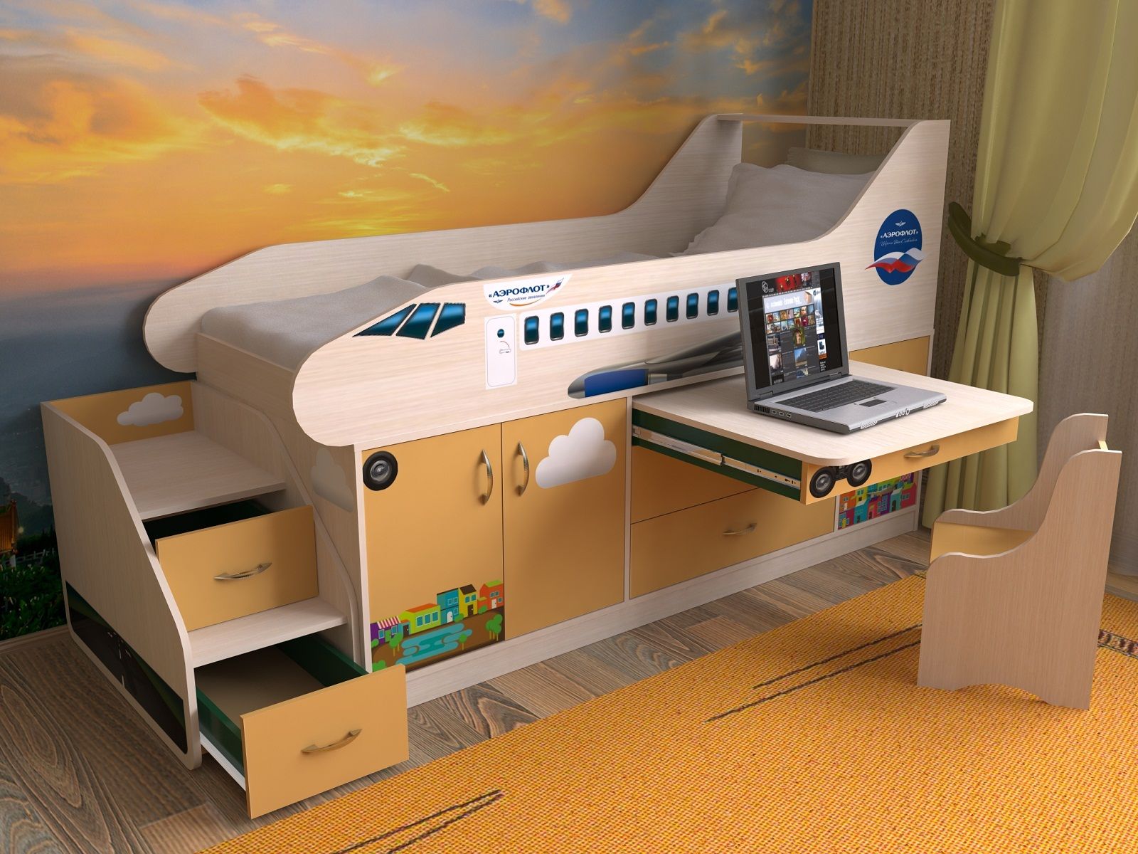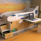 L'éclairage à la tête du lit et une petite table confortable complètent cet ensemble non standard. La table est jetée ou déplacée dans un autre compartiment et devient une étagère. Un large choix de structures complexes de ce type est en vente - la largeur du lit varie en même temps de simple à un an et demi et double. Vous pouvez oublier le problème d'un lit pour votre enfant pendant longtemps si vous achetez un transformateur avec un avion pour dormir jusqu'à deux mètres de long.Elle peut non seulement s'allonger, mais aussi sortir ou rouler du mobilier principal - une armoire, une table ou un autre lit d'une zone plus petite.