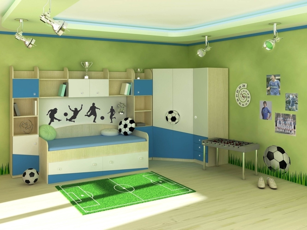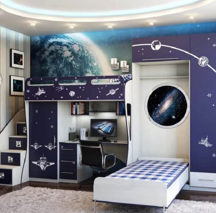 Les stylistes recommandent de rechercher un mélange harmonieux de styles dans la chambre du garçon. La haute technologie et l’industrie se caractérisent par des modèles inhabituels de lits simples et superposés, s’il s’agit d’un minimalisme - l’espace maximal disponible, qui fournira une variété de transformateurs. Le principal est que tout dans la chambre du garçon soit dans l’esprit de ses loisirs - qu’il s’agisse de sport, de musique ou de la quête d’aventure avec des personnages de dessins animés.