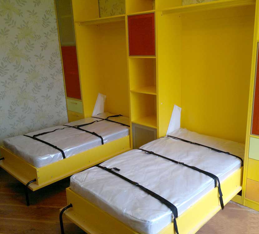 De tels lits, composés d'un ou deux niveaux, constitueront une bonne acquisition pour une petite pièce. Le plus commun d'entre eux - un modèle qui se plie et se rétracte à l'intérieur. La surface verticale pour dormir pendant la journée fait toujours partie du placard; la nuit, elle descend de haut en bas avec les jambes, créant ainsi un excellent lit pour votre enfant. Le fond est dissimulé sous le matériau du meuble, il peut être fermé par des portes.