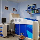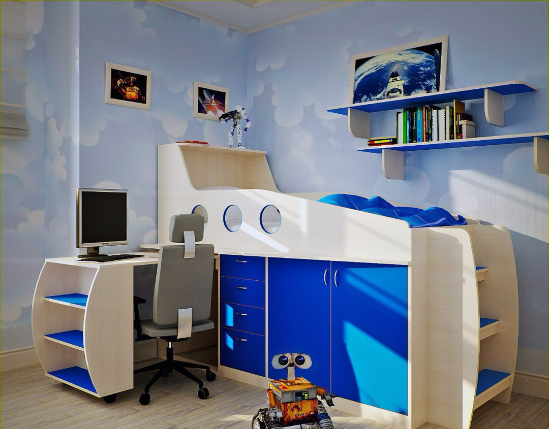 Une pièce pour garçons est composée de bleu, de bleu et d’autres couleurs. Parfois, ils participent tous en même temps ou se croisent avec du blanc, du noir ou du jaune. Mais cela ne signifie pas que la pièce sera sombre ou très peu lumineuse.Votre enfant a sûrement une couleur préférée que vous connaissez. Navires, voitures, avions, espaces présentés sous forme de papier peint ou d'autres éléments de l'intérieur permettront au jeune rêveur de se développer et de vivre dans sa propre atmosphère. Qui sait, peut-être que grâce aux efforts anxieux des parents qui ont créé la bonne atmosphère, vous ferez pousser un véritable cosmonaute.
