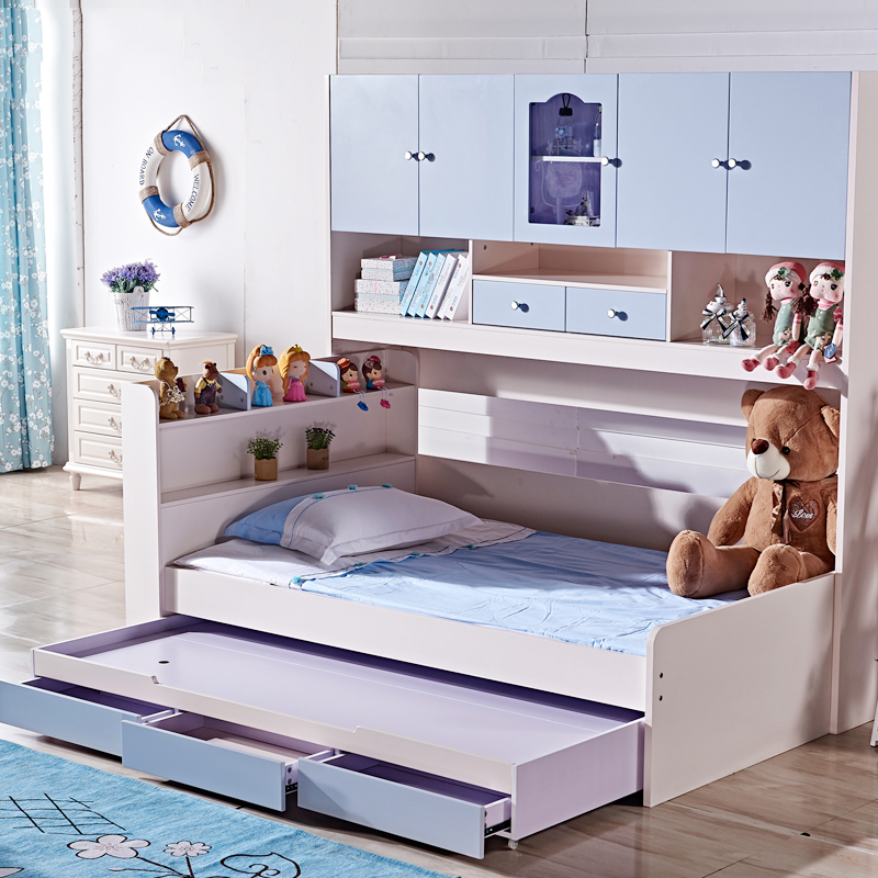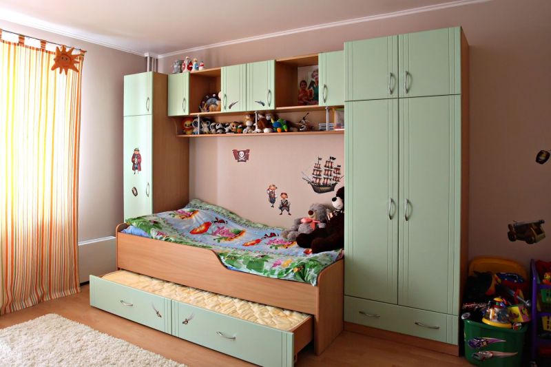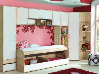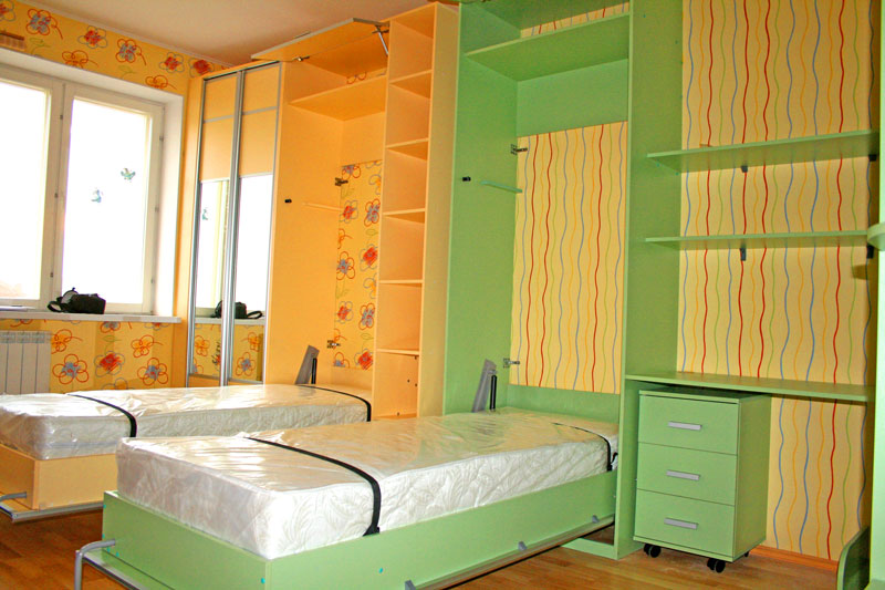 Une des options les plus courantes est une armoire-lit avec un lit pliant. Cela vous permet d'économiser de l'espace sur le plan fonctionnel. Le secret de ce modèle réside dans le fait que, pendant la journée, le dormeur est enlevé pour devenir un bel élément de l’intérieur et que, pendant la nuit, l’enfant dort confortablement dans son lit spacieux. En règle générale, le placard est situé sur le côté ou sur les deux côtés du lit. Idéal pour les petites pièces et les enfants actifs.