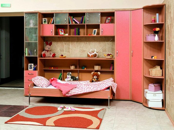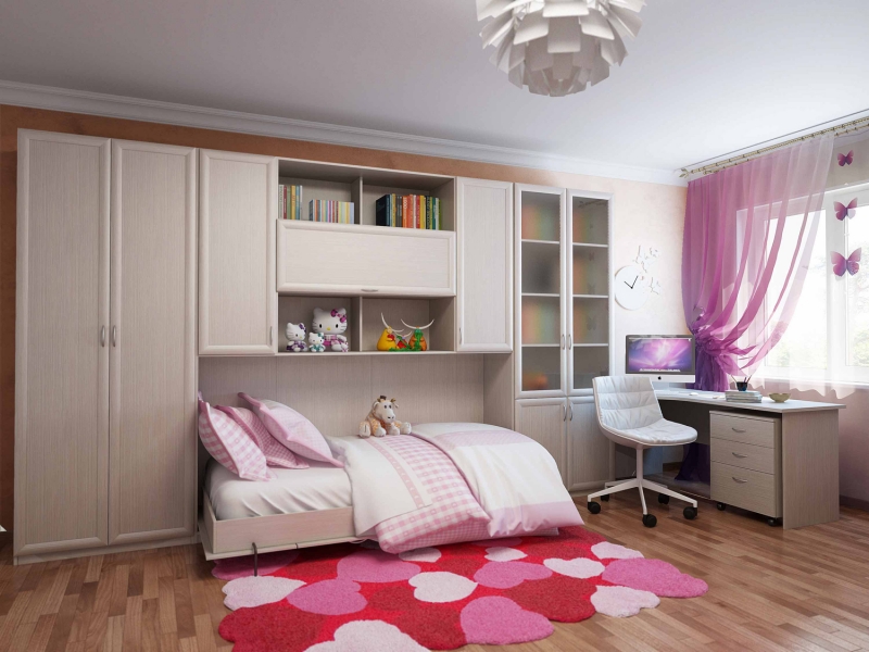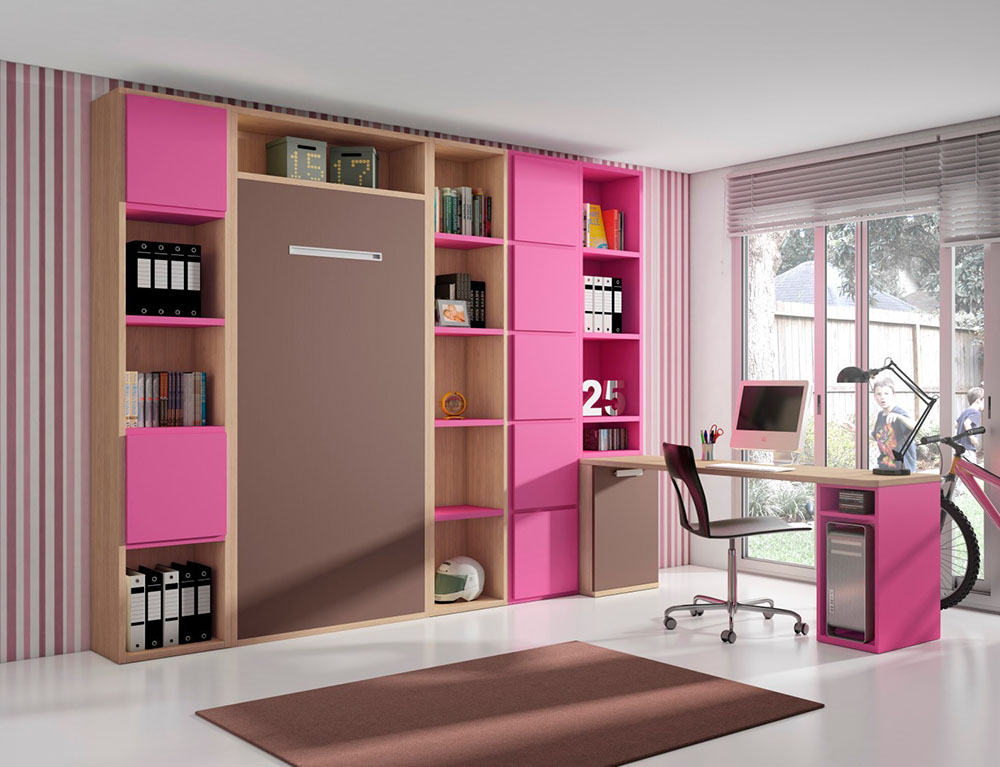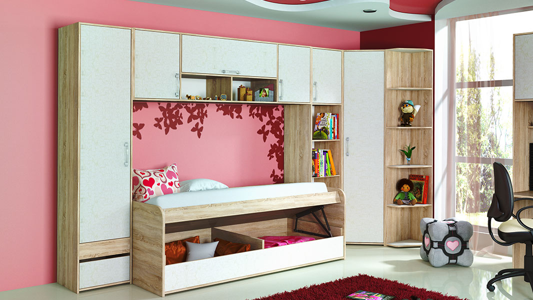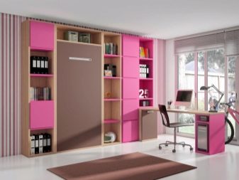 Tout le monde sait que les filles aiment les couleurs délicates. Une armoire-lit pour les filles de couleurs pastel ou florale sera agréable à regarder et inculquera l’amour du confort chez la fille. Le plus souvent, les jeunes femmes choisissent la couleur rose, qui peut servir de base à la création d’un lit. En règle générale, la couleur rose est diluée avec du blanc, du beige ou une autre couleur préférée de l'enfant. Faites attention à la menthe, la lavande, le bleuet et d'autres tons.