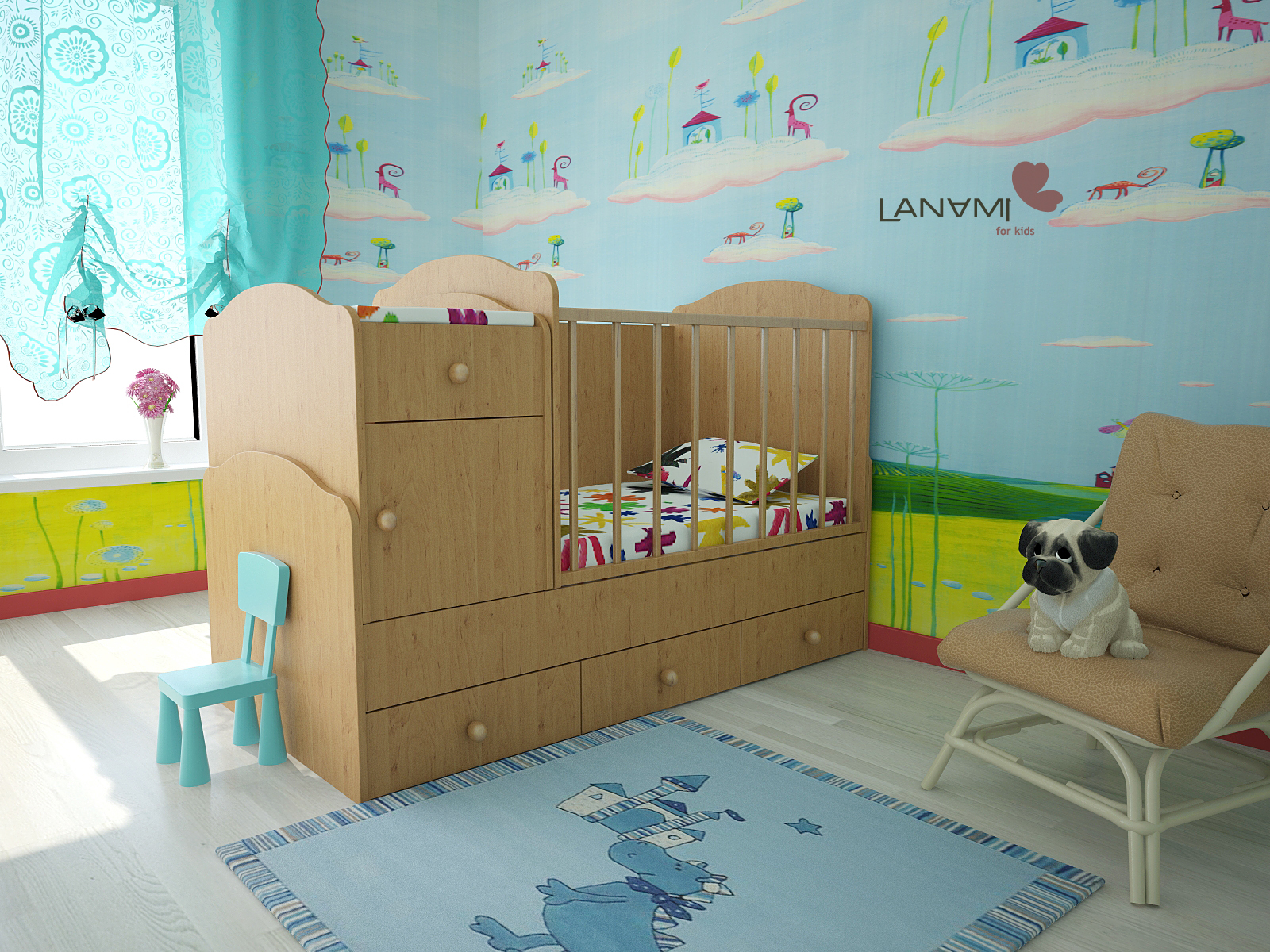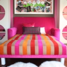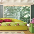 Pour l'originalité de l'intérieur de la chambre des enfants, vous pouvez utiliser deux accessoires brillants qui se détachent sur l'arrière-plan des tons calmes de la pièce. Il peut s'agir d'un oreiller lumineux, d'un couvre-lit avec vos personnages de dessins animés préférés ou d'un magnifique lampadaire de couleur contrastante.