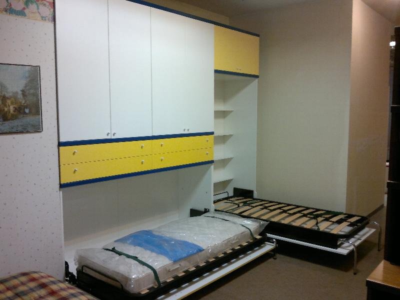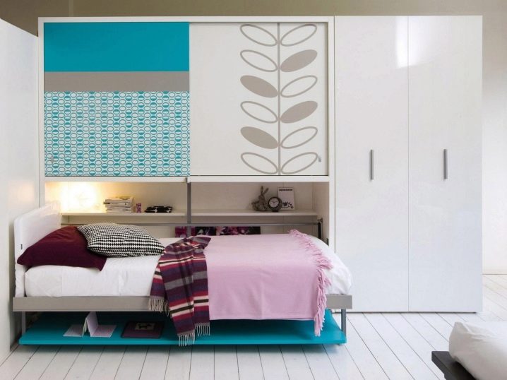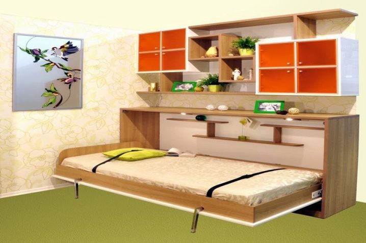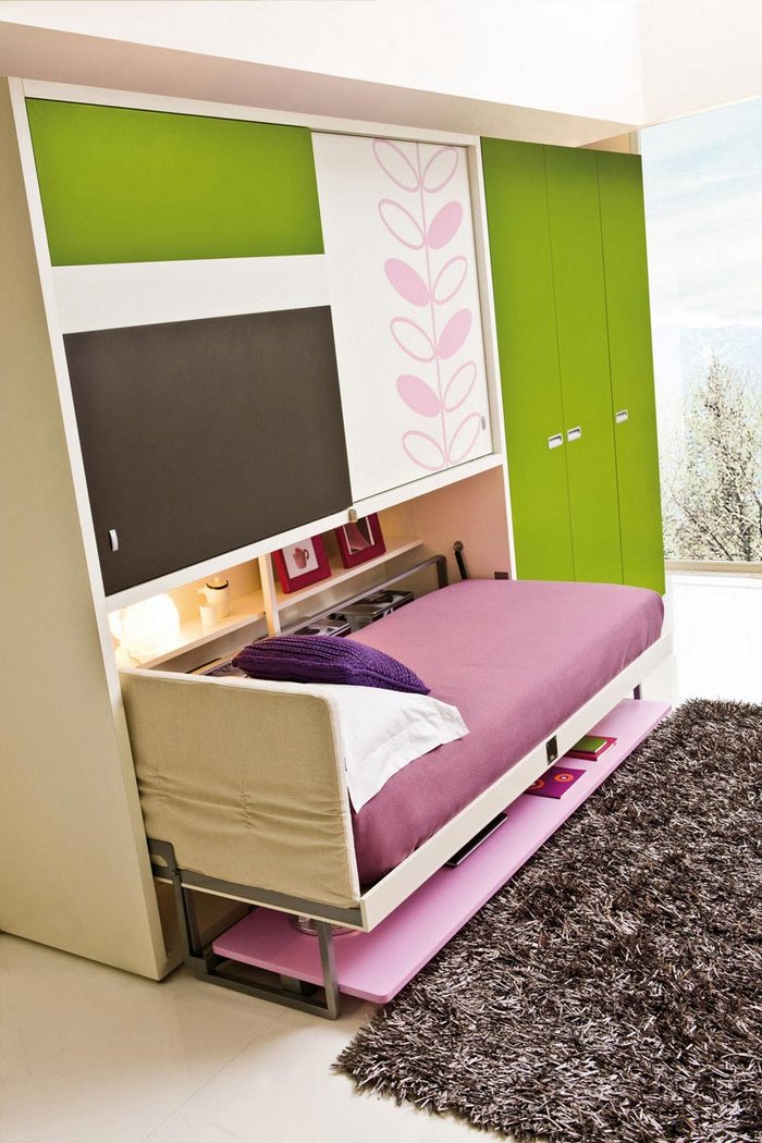 Les lits de transformation sont très pratiques. Leur conception est conçue pour que, pendant le sommeil, la surface de travail soit au-dessus du lit ou en dessous. Dans la journée, le lit est caché.