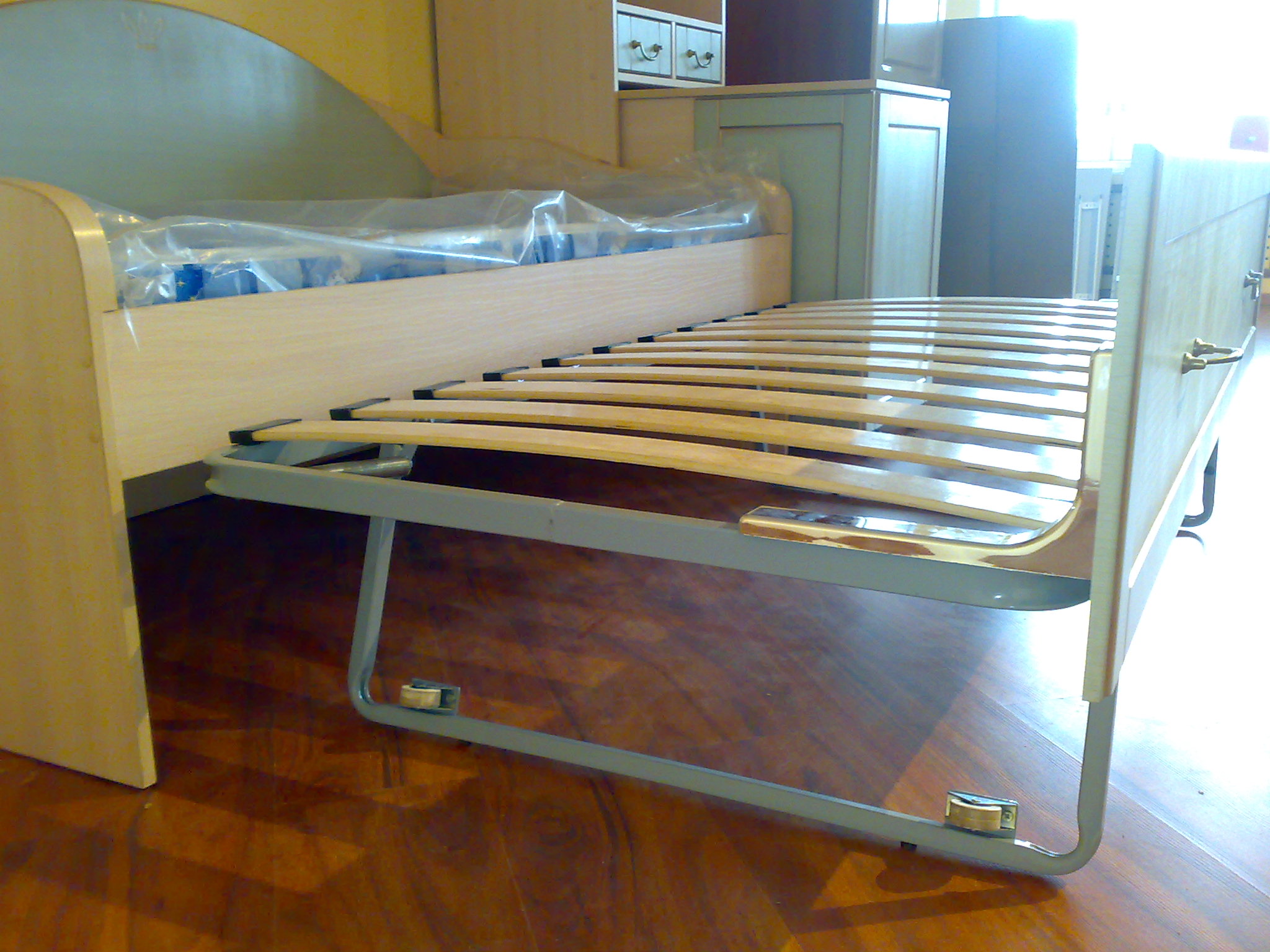 La conception de la commode est semblable à celle du modèle armoire-lit, mais la méthode de transformation est différente. Cette modification est pliante horizontale.Une fois assemblé, ce lit ressemble vraiment à une commode. Sur le dessus et sur les côtés, il y a des compartiments supplémentaires pour la literie et autres choses nécessaires.