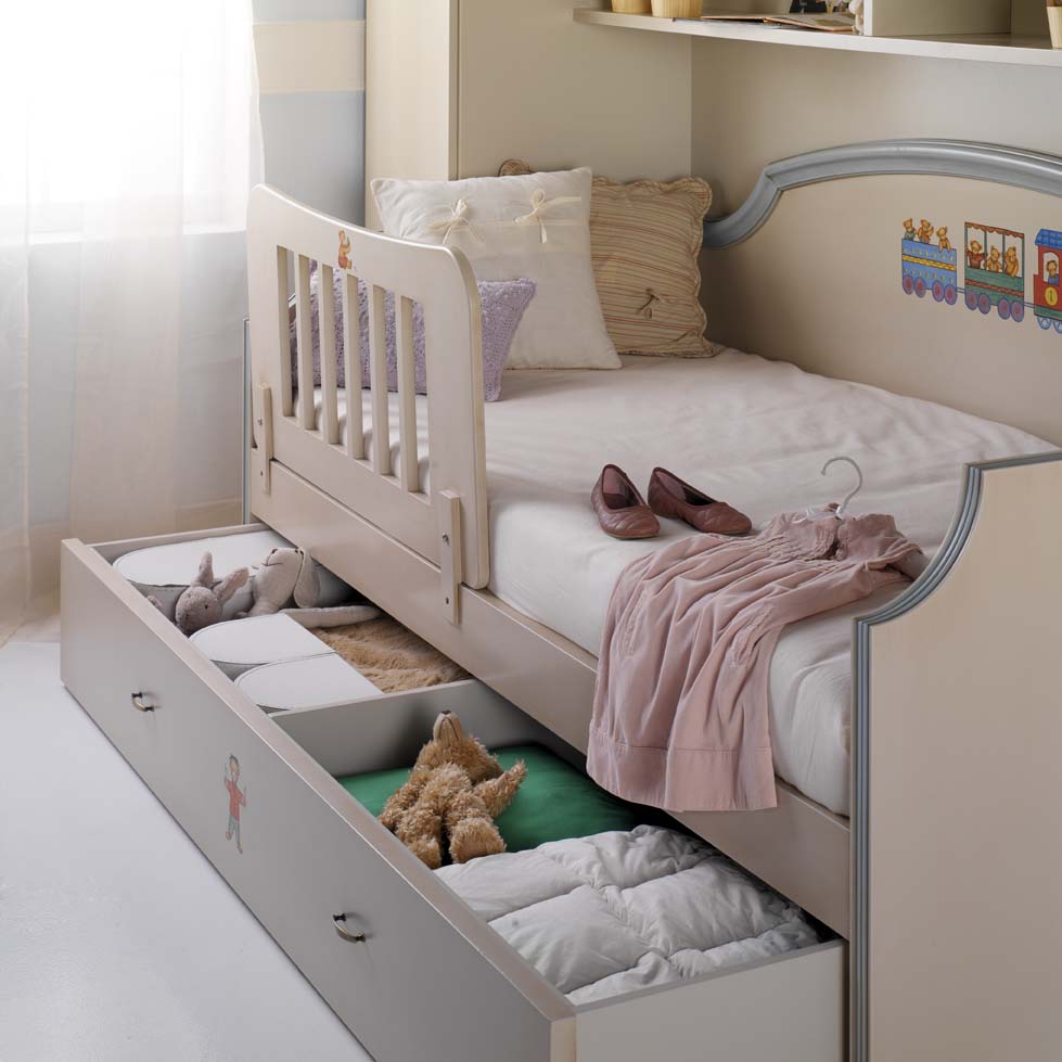Tenez compte de la taille de la pièce lorsque vous choisissez un lit. Un design trop volumineux occupera tout l’espace libre. Dans le même temps, le mobilier ne doit pas être trop simple. Assurez-vous d'avoir besoin d'étagères et de tiroirs pour vos objets personnels. Une bonne organisation de l’espace de lit aidera à rétablir l’ordre dans la chambre de l’enfant.