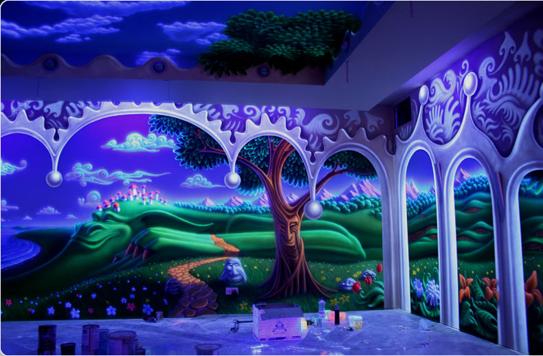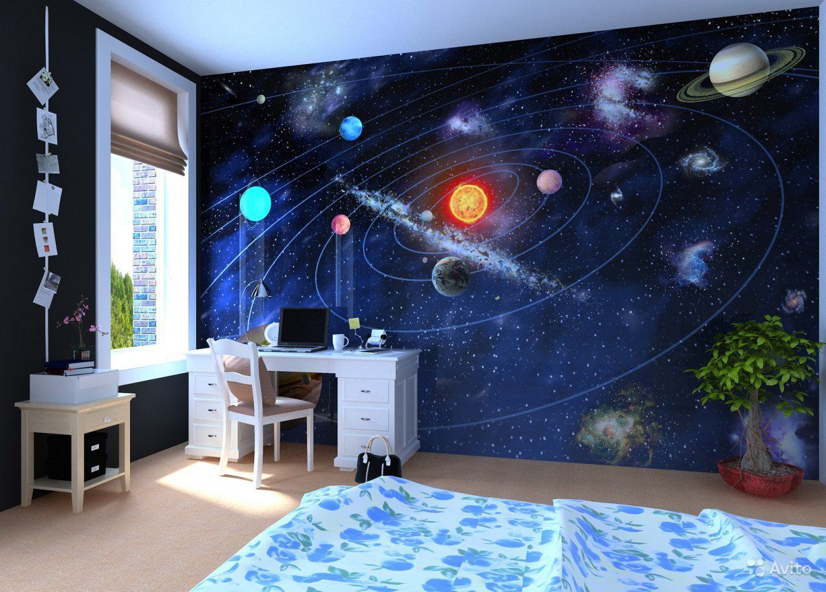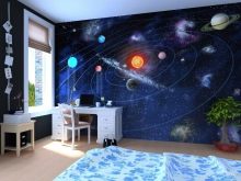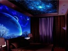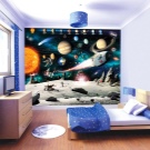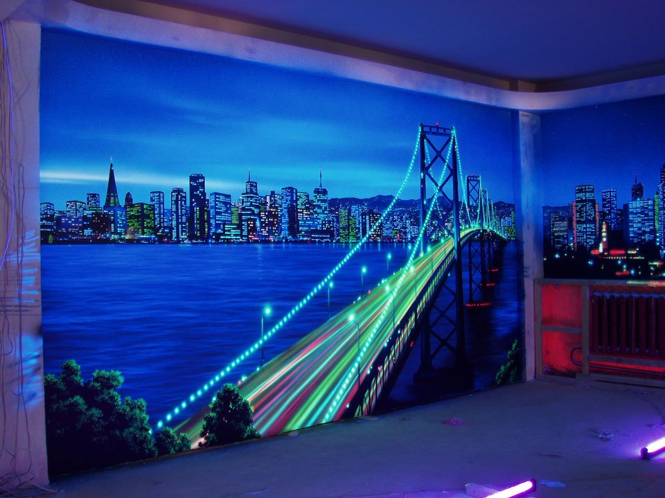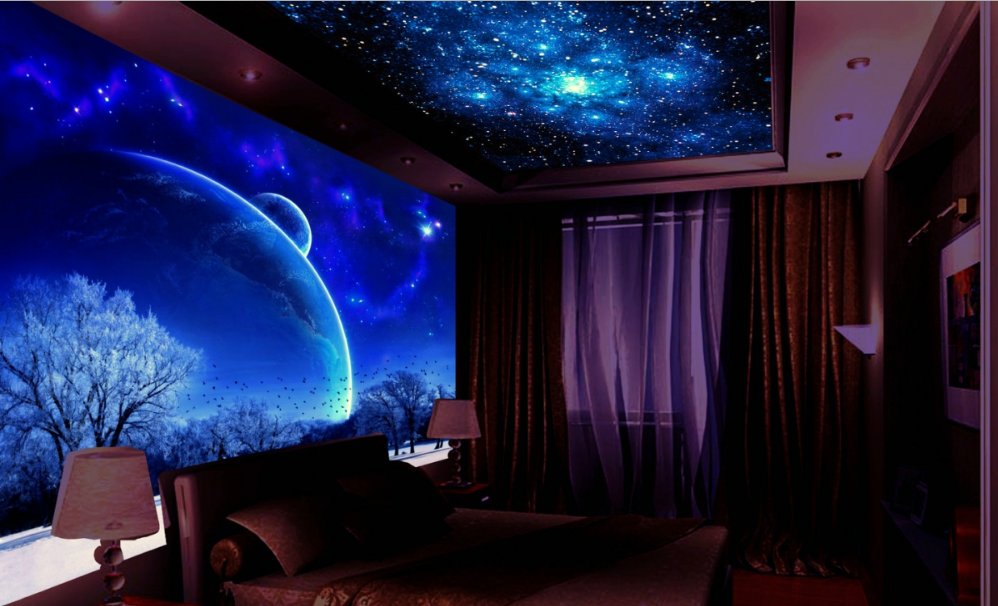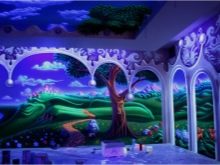 - Papier peint 3D fluorescent - grâce à un revêtement spécial contenant du phosphore, de tels papiers peints 3D brillent dans le noir. Le dessin, appliqué avec une peinture fluorescente, duplique l'image principale et n'apparaît que la nuit, lorsque les lumières sont éteintes dans la chambre des enfants. Pendant la journée, en utilisant la lumière du soleil ou la lumière de lamas spéciaux, l'image fluorescente est chargée afin qu'une image lumineuse inhabituelle puisse être vue sur le mur la nuit.Les parents achètent souvent des papiers peints 3D fluorescents dans la chambre des garçons et des filles pour remplacer les veilleuses ordinaires. Par exemple, des papiers peints photos fluorescents pour les garçons avec une image d’une galaxie aideront à créer une atmosphère inexplorée dans une pièce, afin de stimuler un enfant à explorer et à développer la fantaisie.
