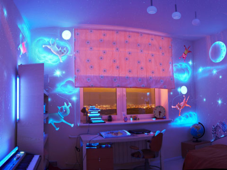 - Fond d'écran LED 3D - consiste en un grand nombre de petites LED montées dans la puce. Le papier peint à LED 3D aura l'air intéressant dans une pièce d'adolescent. En utilisant une télécommande spéciale ou une application sur un smartphone, l'enfant pourra régler la luminosité, la palette de couleurs, la teinte et même l'image. En plus du papier peint fluorescent, ils peuvent être utilisés comme veilleuse. Un avantage important du papier peint 3D à LED est la possibilité d'éteindre la lueur à tout moment.