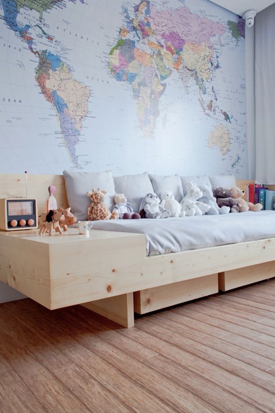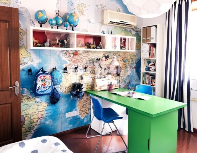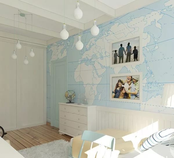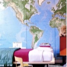 Très souvent, les concepteurs conseillent de ne pas coller les quatre murs de la pièce et d’en sélectionner un seul à l’aide du papier peint. La carte du monde constituera un élément lumineux de l’intérieur sur fond de tons calmes.Il est préférable d’utiliser des tons pastel clairs, tels que le beige, le blanc et le vert pâle.