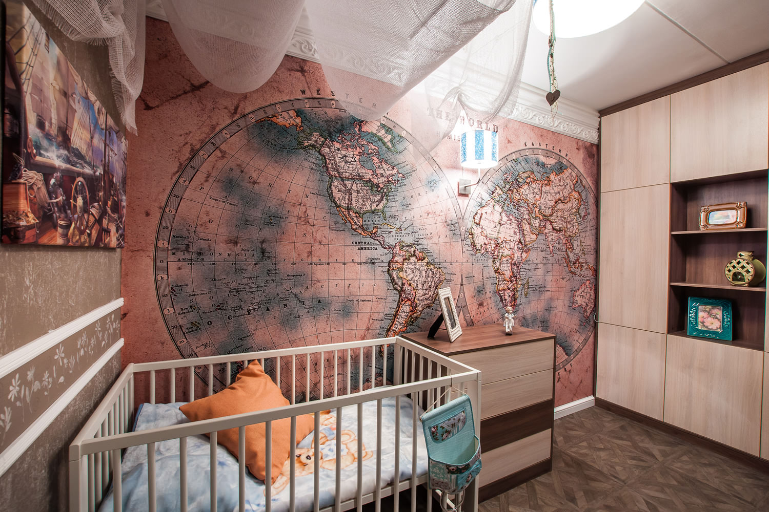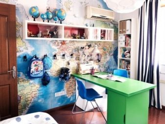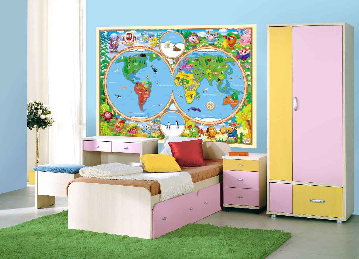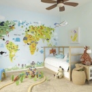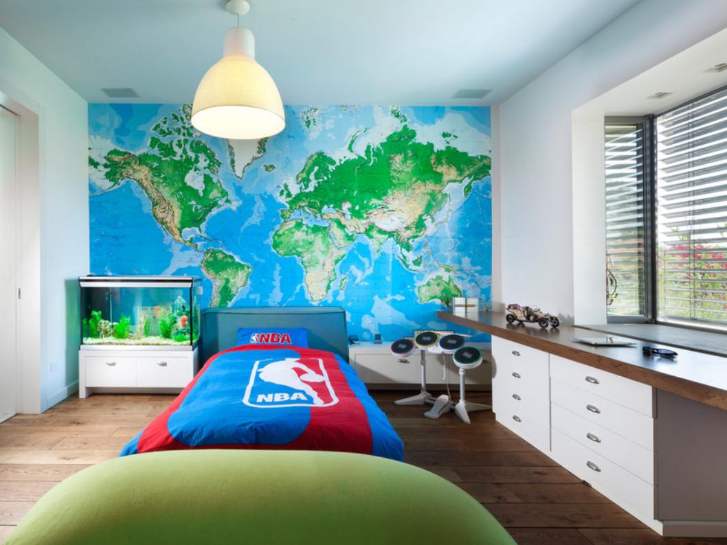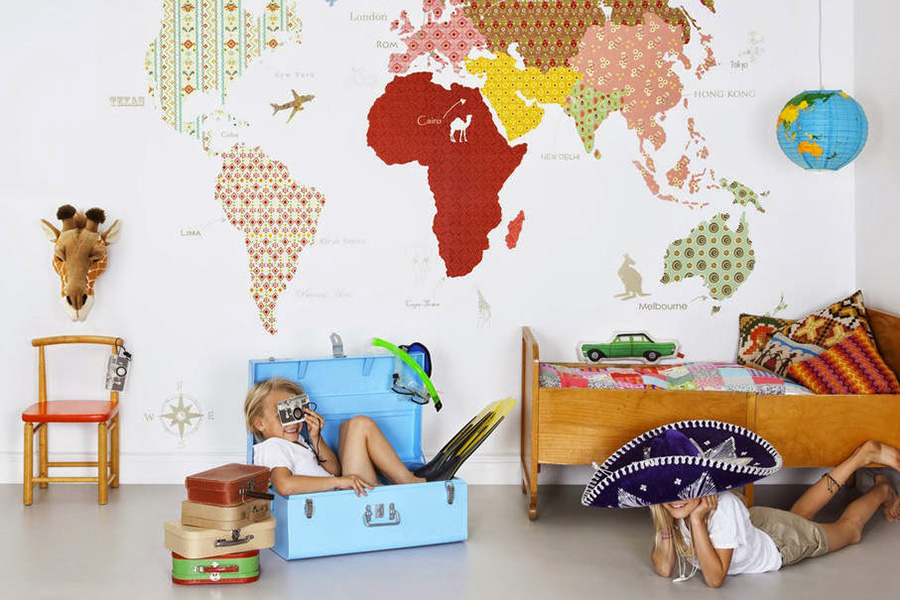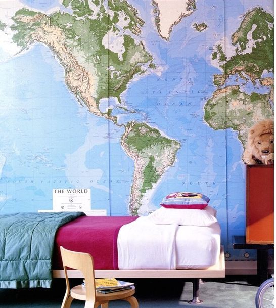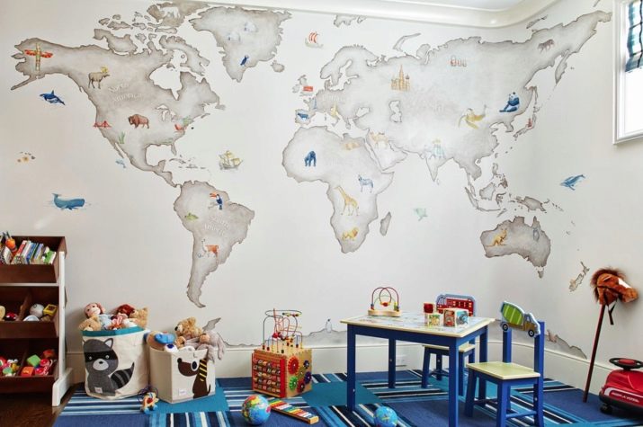 Dans le monde d'aujourd'hui, de nombreuses personnes accordent une attention particulière à l'intérieur de la maison. Les idées originales et inhabituelles sont de plus en plus populaires. La chambre des enfants fait partie intégrante de l'espace familial. Les parents essaient souvent de décorer la chambre d’un enfant en utilisant des méthodes qui influeront de manière positive sur leur développement créatif. L’un d’eux est considéré comme recouvrant le mur à l’aide du papier peint photo «Carte du monde».