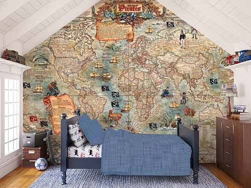 - Vieux Ce type est plus approprié pour une étude ou une bibliothèque, car il possède une apparence inhérente et une apparence raffinée, ainsi que des teintes marron et turquoise. Mais l'image elle-même suggère d'anciens marins et même des pirates, c'est-à-dire des aventures. De tels fantasmes ont un effet positif sur l'humeur et les idées.