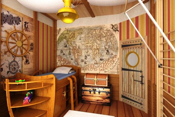 Pour une apparence harmonieuse, il faut souligner le design thématique de la pièce avec des accessoires. Ce sont des éléments décoratifs bien adaptés qui seront utilisés comme décoration. Si la taille de la pépinière le permet, les articles peuvent être plus volumineux; si la pièce est petite, les objets de table conviendront parfaitement.Cela peut être un globe ou un coffre.
