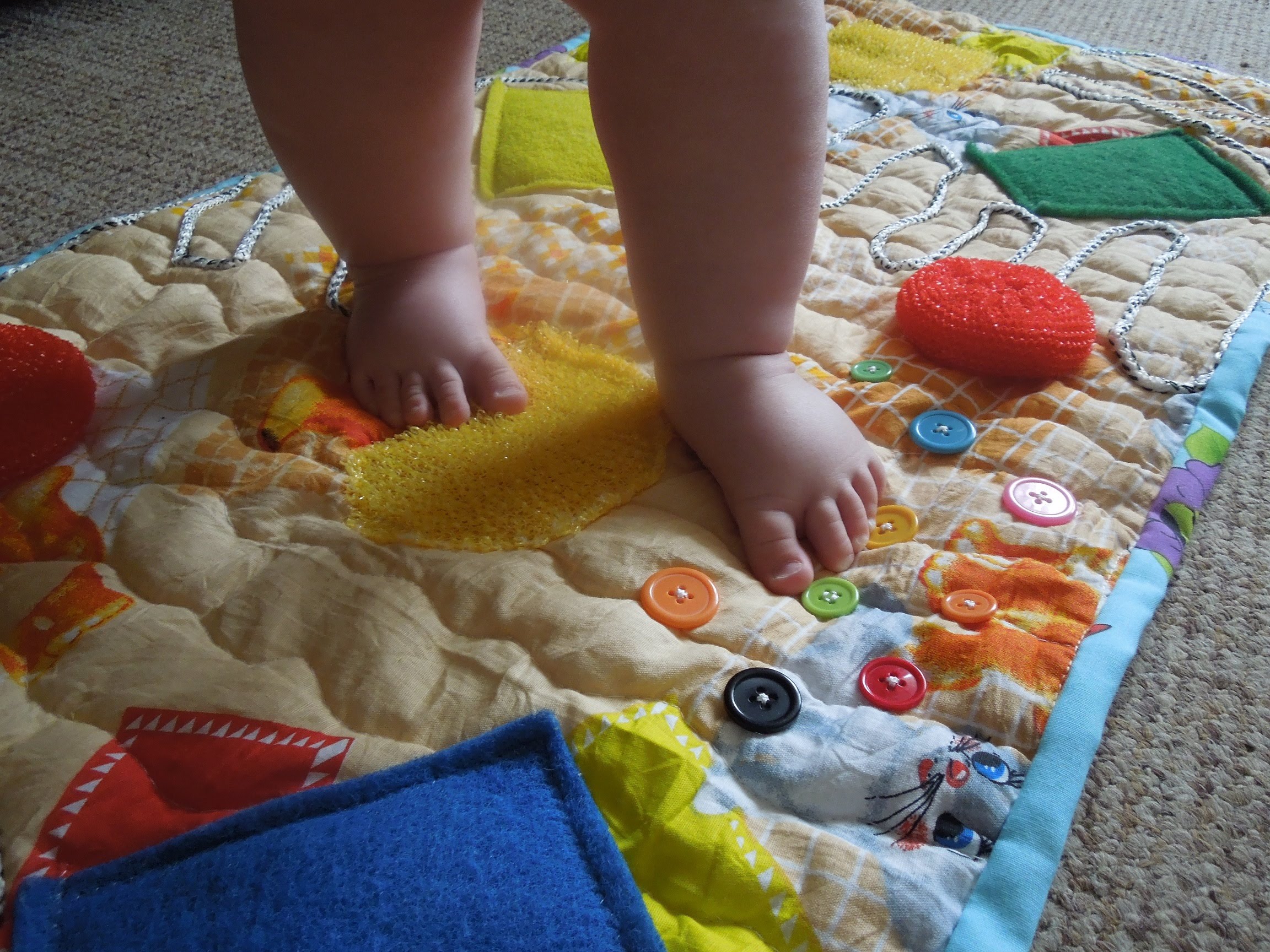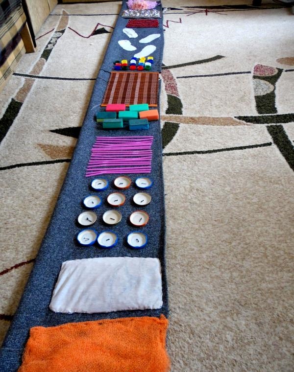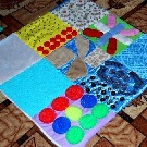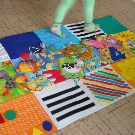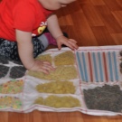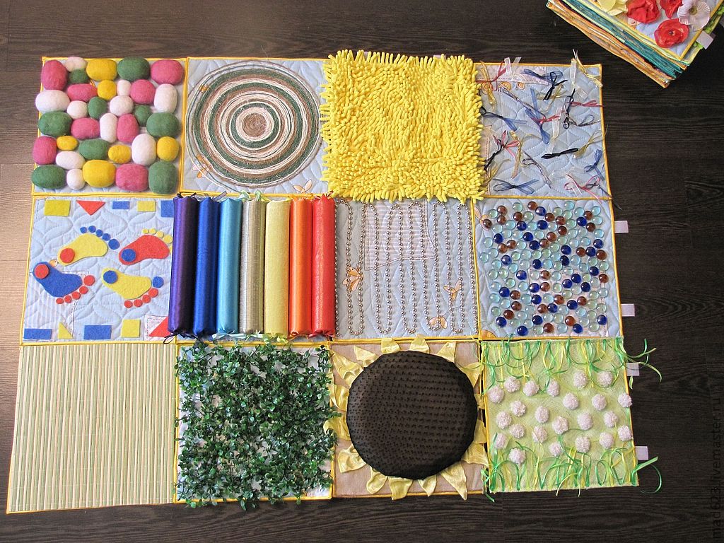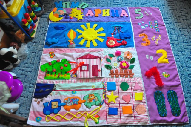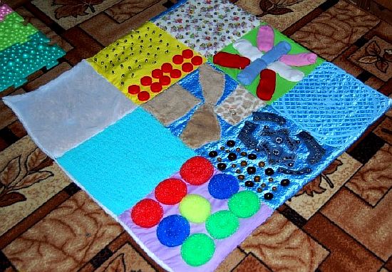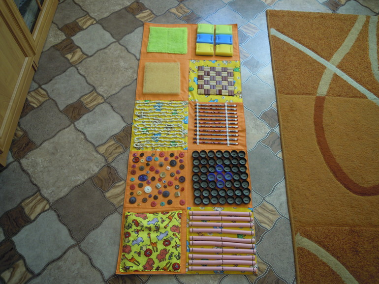 Si les boutons et les autres petites pièces vous cousent bien, vous pouvez coudre les poches des serrures et simplement y insérer divers remplissages. Il peut s'agir de chiffons - vous obtenez des bosses douces et divers produits d'épicerie tels que le sarrasin, les pois et les haricots - des bosses plus dures. Vous pouvez décorer un tapis de différentes manières, ce qui suffit à votre imagination, mais plus le tapis est drôle, plus il est facile d'attirer un enfant à le pratiquer.