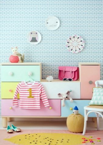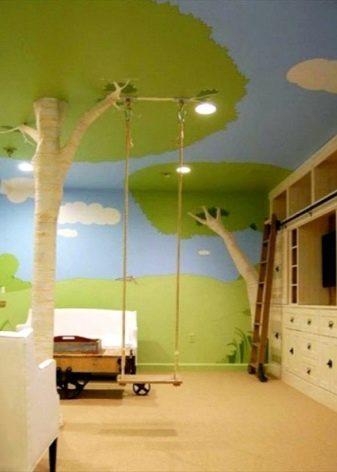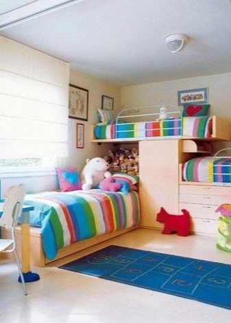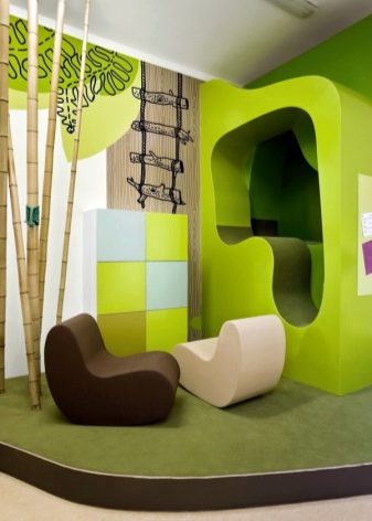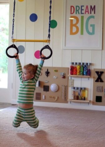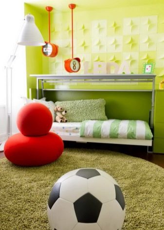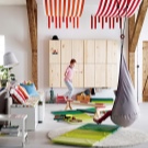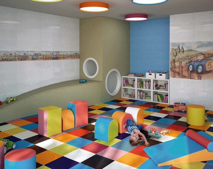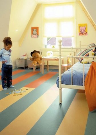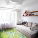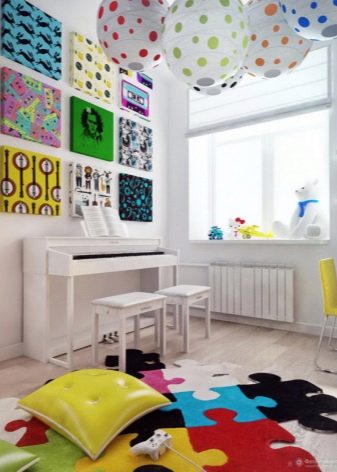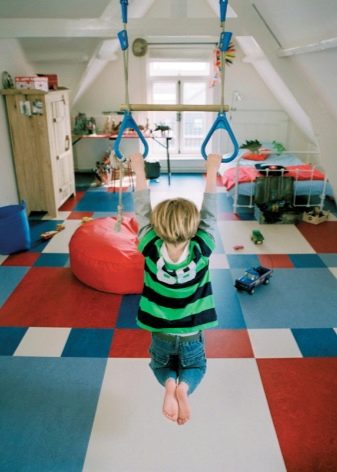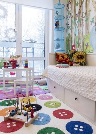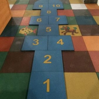 Dans une pièce remplie de meubles aux couleurs vives, un revêtement modulaire doux avec des dessins et des puzzles s’harmonisera. Le revêtement de sol en caoutchouc décorera la pépinière d'un petit athlète, surtout s'il est combiné à un tapis de différentes couleurs lors de la pose.