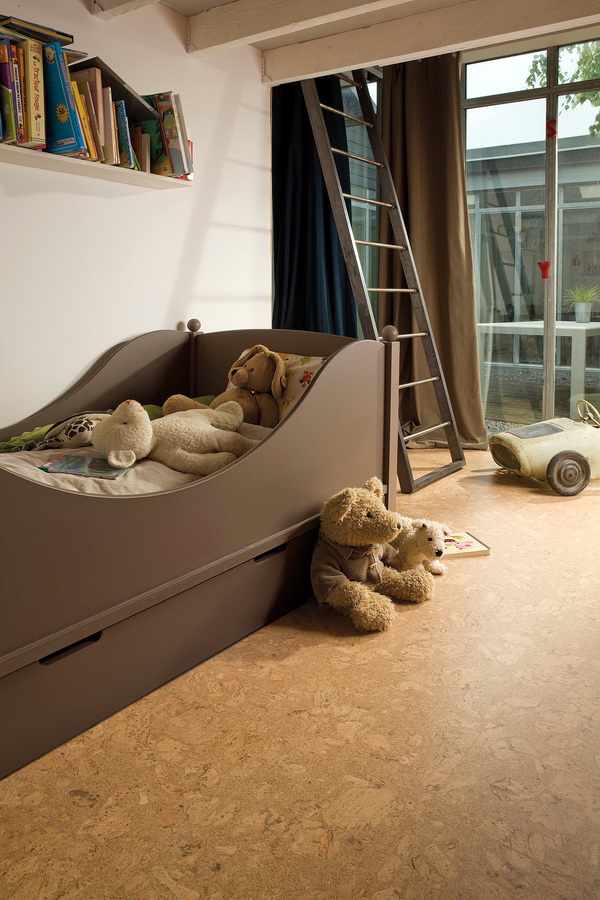 Le parquet en liège est un choix plutôt unique pour la chambre d'un enfant, car il peut offrir de nombreux conforts pour un tapis, sans la plupart de ses inconvénients. Une fois installé, le sol en liège se montre doux et élastique sous les pieds, et il peut être rendu encore plus doux en le posant en deux couches. Et ceci en dépit du fait que le revêtement de liège ressemble à du bois dur.